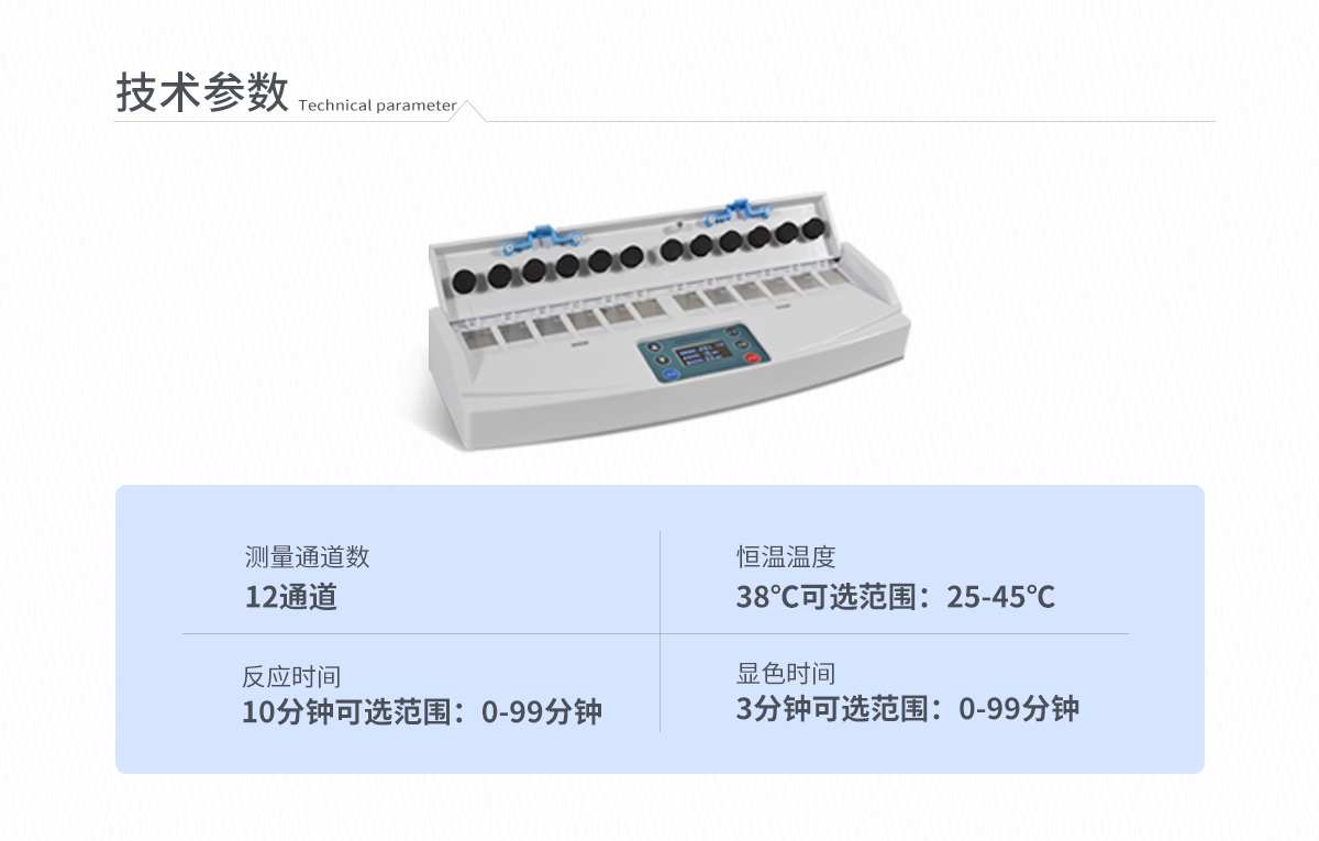 | 測量通道數(shù):12通道 | 恒溫溫度:38℃可選范圍:25-45℃ | 反應(yīng)時間:10分鐘可選范圍:0-99分鐘 | 顯色時間:3分鐘可選范圍:0-99分鐘 |