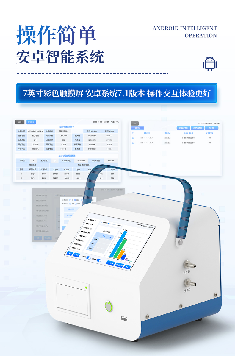 | 1、安卓系統(tǒng)7.1版本,操作交互體驗(yàn)更好。 | 2、內(nèi)置溫濕度傳感器、環(huán)境氣壓傳感器 | 3、核心部件光散射傳感器明顯消除腔體的雜散光,信噪比大為提高。從而使測量更準(zhǔn)確更可靠。 | 4、按95%置信度(UCL)計(jì)算,計(jì)數(shù)結(jié)果可換算成m3和ft3 | 5、依照凈化級別劃分和規(guī)定,自動(dòng)判定凈化級別,使用便利。 | 6、帶審計(jì)追蹤功能,可查詢、可追溯、可控制,符合FDA 21CFR PART11規(guī)范 | 7、支持wifi、藍(lán)牙傳輸,數(shù)據(jù)可無線上傳;同時(shí)支持U盤拷貝數(shù)據(jù),免驅(qū)動(dòng)插拔。 | 8、配置監(jiān)管平臺,檢測結(jié)果可直接無線傳至平臺,進(jìn)行潔凈度長短期分析,輔助管理。 | 9、內(nèi)置新一代高速熱敏打印機(jī),可選擇所需要打印的粒徑通道,靈活打印結(jié)果。 | 10、交直流兩用,內(nèi)置充電鋰電池,環(huán)保耐用可支持連續(xù)采樣6小時(shí)以上。 | 11、便捷簡易伸縮式云臺支架,安裝采樣操作更加方便。 |