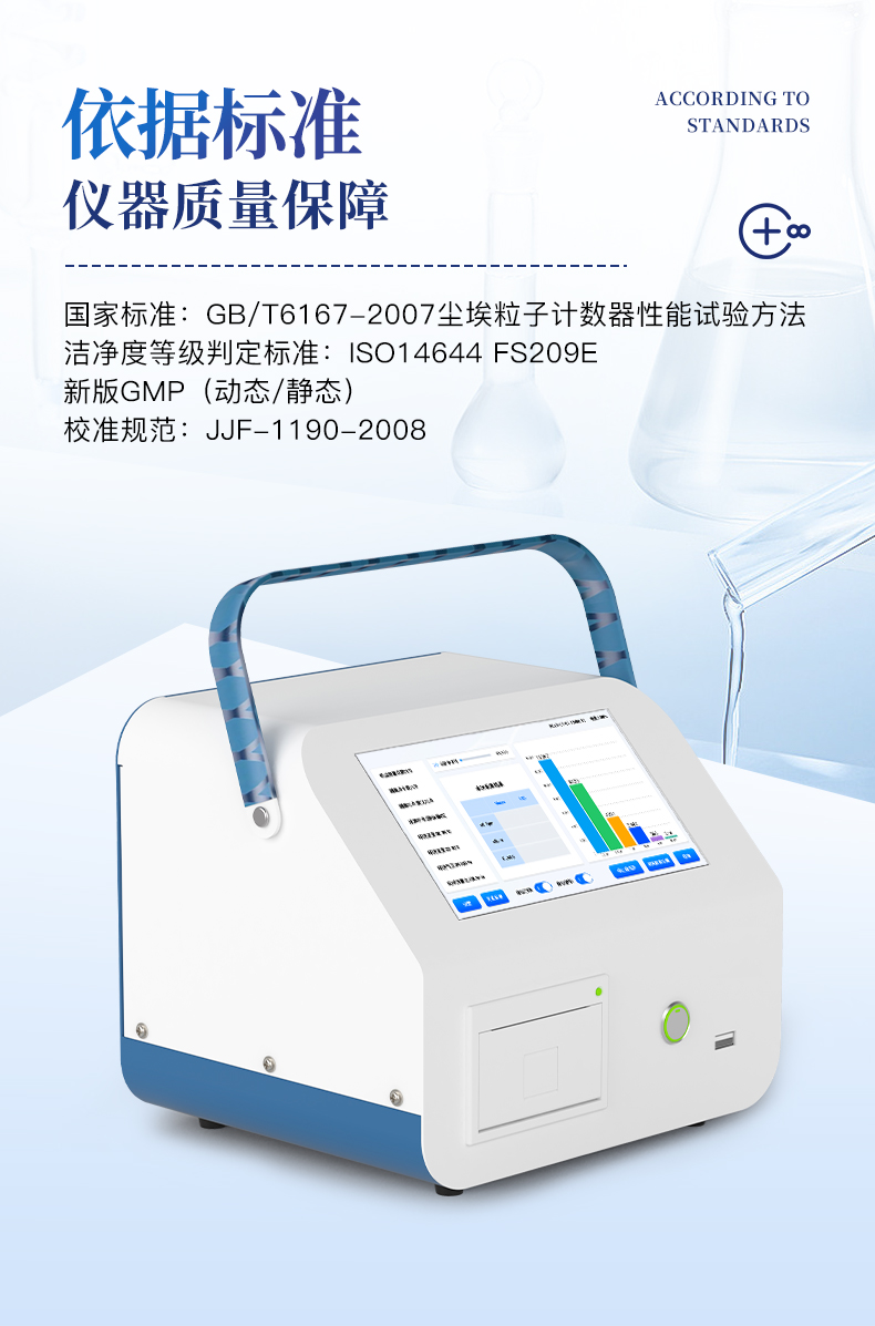國家標(biāo)準(zhǔn):GB/T6167-2007塵埃粒子計(jì)數(shù)器性能試驗(yàn)方法 潔凈度等級判定標(biāo)準(zhǔn):ISO14644 FS209E ,新版GMP(動(dòng)態(tài)/靜態(tài)) 校準(zhǔn)規(guī)范:JJF-1190-2008
