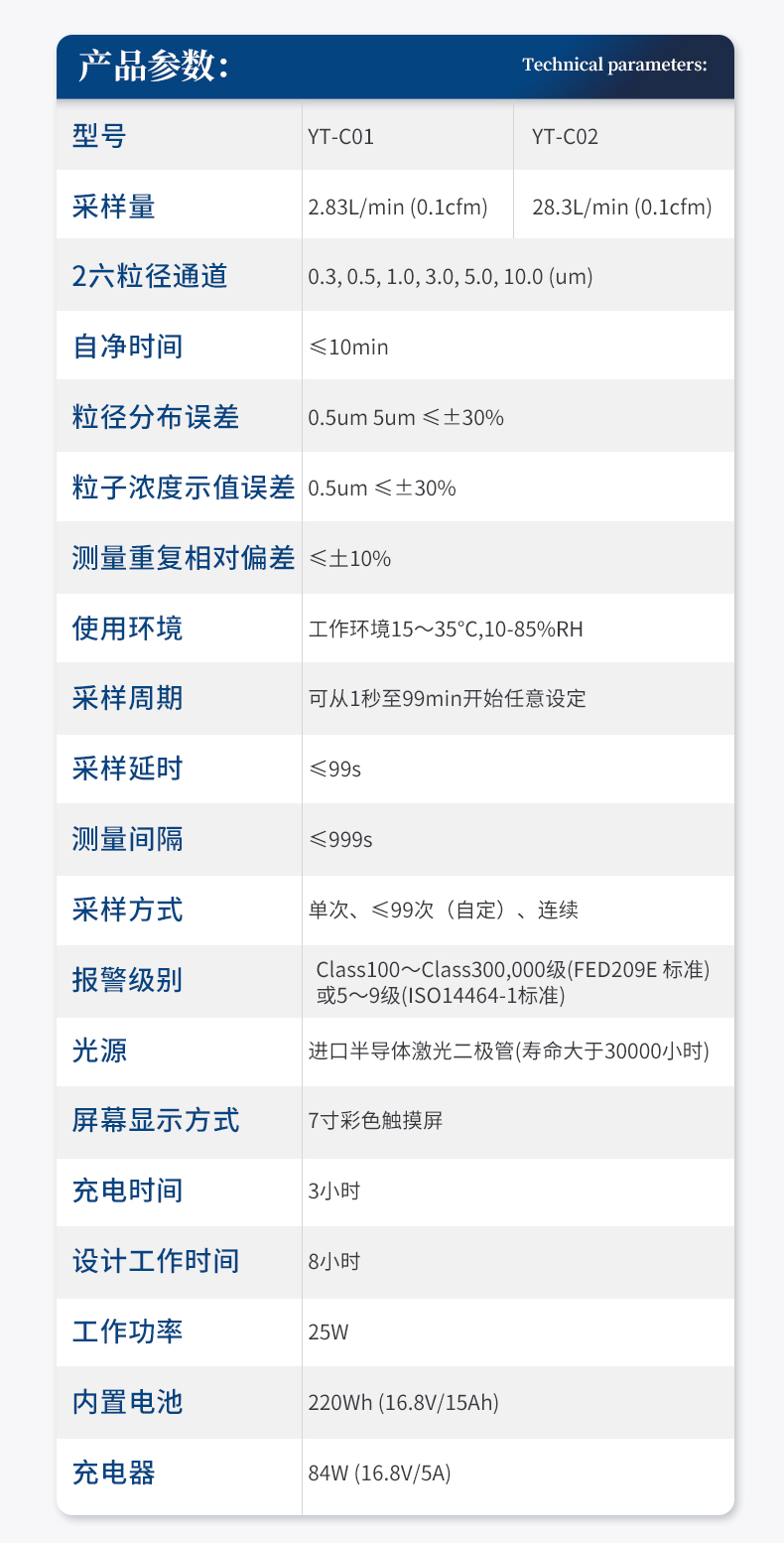 | 采樣量:2.83L/min (0.1cfm) | 六粒徑通道:0.3,0.5,1.0,3.0,5.0,10.0(μm) | 自凈時(shí)間:≤10min | 粒徑分布誤差:0.5um 5um ≤±30% | 粒子濃度示值誤差:0.5um ≤±30% | 測量重復(fù)相對偏差:≤±10% | 使用環(huán)境:工作環(huán)境15~35℃, 10-85%RH | 采樣周期:可從1秒至30000秒開始任意設(shè)定 | 采樣延時(shí):≤60s | 測量間隔:≤60s | 采樣方式:單次、≤99次(自定)、連續(xù) | 報(bào)警功能:通過設(shè)置報(bào)警參數(shù)實(shí)現(xiàn)顆粒數(shù)報(bào)警 | 光源:進(jìn)口半導(dǎo)體激光二極管(壽命大于30000小時(shí)) | 屏幕顯示方式:7寸彩色觸摸屏 | 數(shù)據(jù)內(nèi)存容量:1--10萬條,可查詢,可導(dǎo)出。 | 充電時(shí)間:2小時(shí) | 設(shè)計(jì)工作時(shí)間:8小時(shí) | 平均功率:7.5W | 內(nèi)置電池:74Wh(16.8V/5Ah) | 充電器:50W(16.8V/3A) |