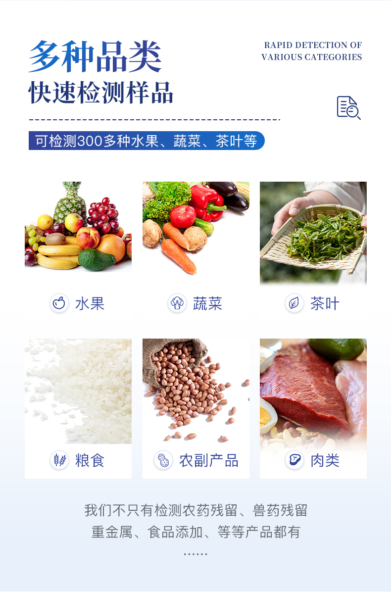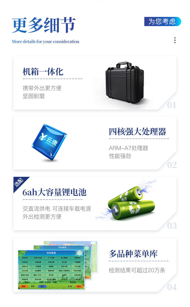 | 隨著人民生活水平的不斷提升,市場對茶葉的把控愈加嚴格。針對現(xiàn)狀,我司專門研發(fā)生產(chǎn)--茶葉專用的農(nóng)藥殘留速測儀;定位茶農(nóng)、茶商、茶葉企業(yè)使用。 此外還可用于果蔬茶生產(chǎn)基地和農(nóng)貿(mào)批發(fā)銷售市場現(xiàn)場檢測,餐館、學(xué)校、食堂、家庭果蔬加工前的安全速測等。 | 檢測通道: 5個檢測通道,可以同時測試多個樣品,每個樣品由程序控制分別獨立工作,不會互相干擾。 | 顯示方式:≥5英寸液晶觸摸屏顯示,人性化中文操作界面,讀數(shù)直觀、簡單。 | 配備嵌入式高速熱敏打印機,可選擇手動打印或者自動打印,三分鐘出打印結(jié)果。 | 光源采用進口超高亮發(fā)光二極管,具有低功耗、穩(wěn)定性強、高靈敏度,高檢測精度,高重復(fù)性精度,光源可控、響應(yīng)速度快等優(yōu)點。 | 采用標準USB接口設(shè)計,免驅(qū)動安裝,方便數(shù)據(jù)的存貯和移動,并可隨時與計算機直接相連,并且可用計算機控制儀器。實現(xiàn)數(shù)據(jù)查詢、瀏覽、分析、統(tǒng)計、打印等。 | 智能化程度高,儀器具有自檢功能:具有開機自檢和調(diào)零功能,具有自動檢測重復(fù)性功能 | 內(nèi)置強大的數(shù)據(jù)庫,可在儀器上直接選擇樣品名稱、檢測指標、送檢單位等信息,也可在儀器上直接編輯錄入樣品名稱、檢測指標、送檢單位等信息并保存進樣品數(shù)據(jù)庫。 | 支持Wifi網(wǎng)絡(luò),數(shù)據(jù)可局域網(wǎng)和互聯(lián)網(wǎng)數(shù)據(jù)上傳,檢測結(jié)果直接傳至食品安全監(jiān)管平臺。進行區(qū)域食品安全監(jiān)管及大數(shù)據(jù)分析處理,檢測區(qū)域食品安全長短期動態(tài),達到食品安全問題預(yù)估、預(yù)警 |