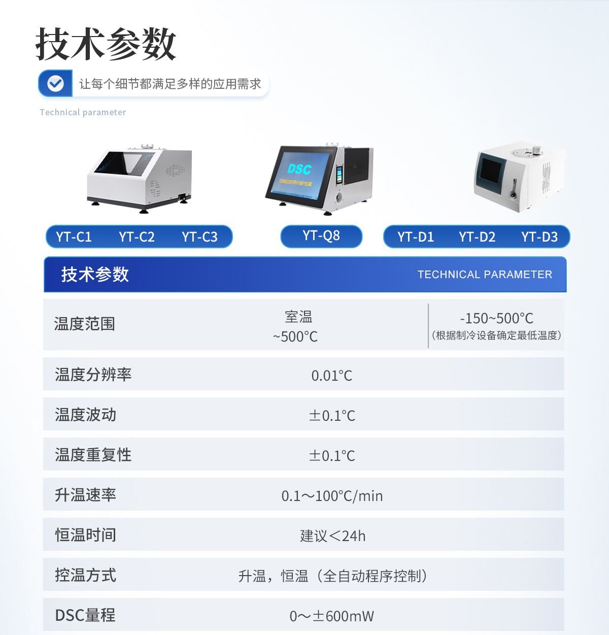 1.溫度范圍: 室溫~500℃ 2.溫度分辨率: 0.01℃ 3.溫度波動: ±0.1℃ 4.溫度重復(fù)性: ±0.1℃ 5.升溫速率: 0.1~100℃/min 6.恒溫時間:建議<24h 7.控溫方式:升溫,恒溫(全自動程序控制) 8.DSC量程: 0~±600mW 9.DSC解析度: 0.01mW 10.DSC靈敏度: 0.01mW 11.工作電源: AC220V/50Hz或定制 12. 氣氛控制氣體:氮氣、氧氣(儀器自動切換) 13.氣體流量:0-300mL/min 14.氣體壓力:0.2MPa 15.顯示方式: 8寸 LCD觸摸屏顯示,超硬度儀器面膜設(shè)計。