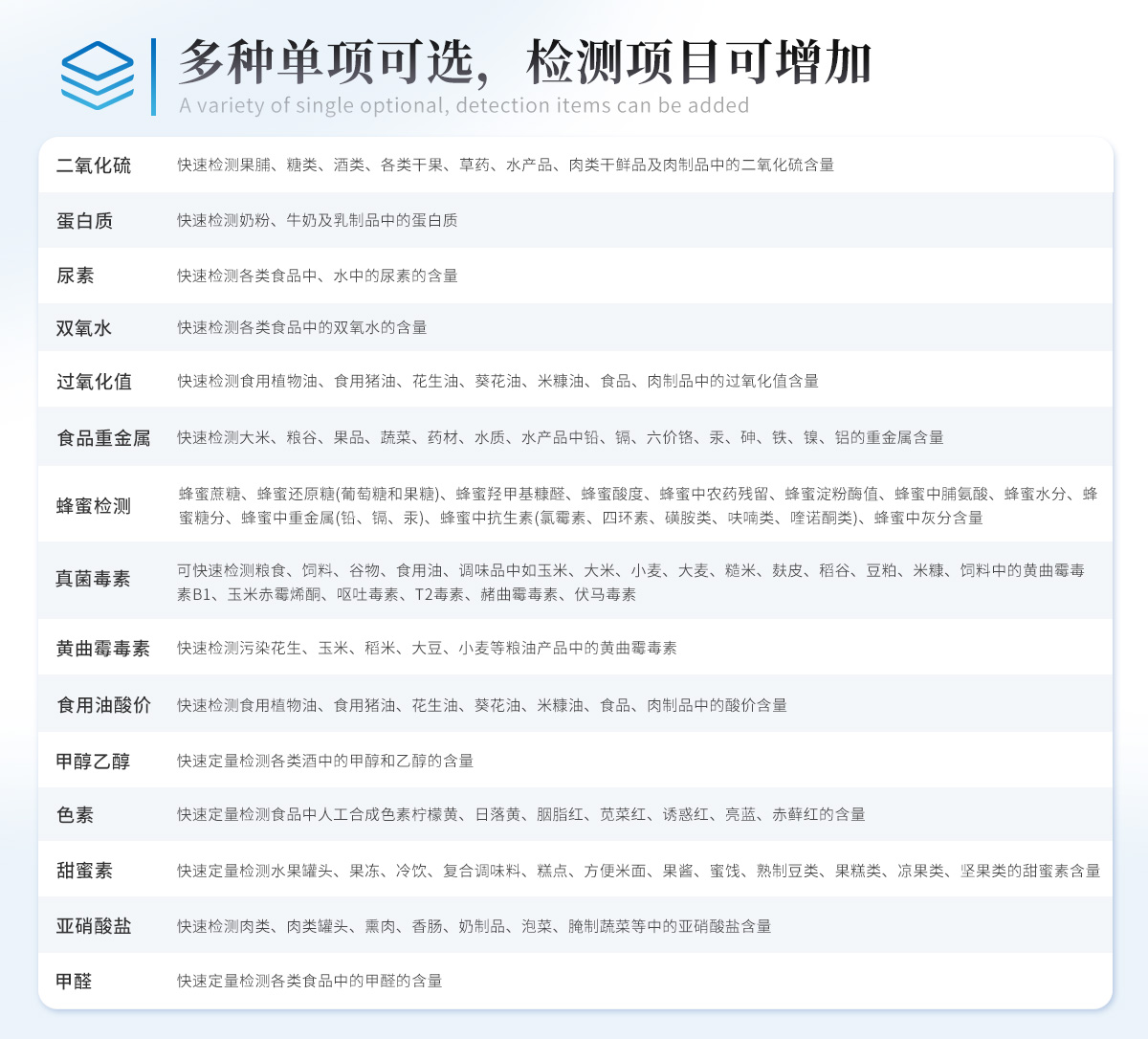 可快速檢測(cè)奶粉、牛奶及乳制品中的蛋白質(zhì),儀器預(yù)留其他項(xiàng)目檢測(cè)程序和端口,根據(jù)日后需求可方便的自主增加檢測(cè)項(xiàng)目。