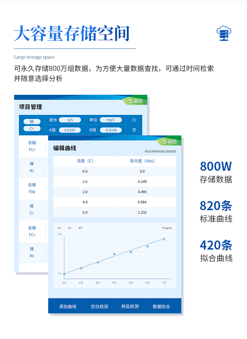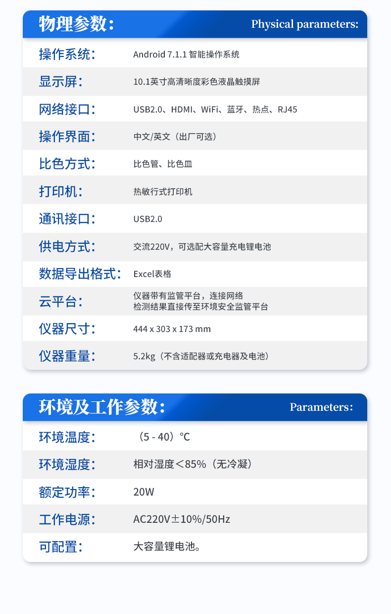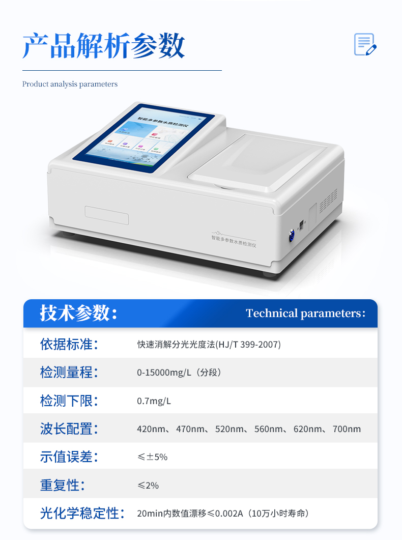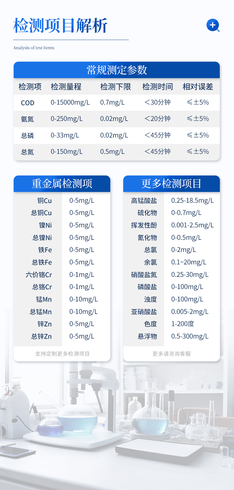 主要檢測COD、氨氮、總磷、總氮、磷酸根、硝酸鹽氮、總銅、銅、鉻、總鉻、鋅、總鋅、亞鐵、鎳、總鎳、錳、總錳、二氧化硅、總氯、余氯、鎘、鉛、鈦、釩、銀、鋁、硼、砷、錫、鈹、鋇、銻、汞、鈷、高錳酸鹽、硫酸鹽、氟化物、硫化物、氰化物、總氰化物、揮發(fā)性酚、苯胺、甲醛、甲醇、吊白塊、二氧化硫、雙氧水、濁度、色度、懸浮物、溶解氧、尿素、氰尿酸、亞硝酸鹽、臭氧、pH、二氧化氯等指標(biāo),兼具智能數(shù)據(jù)分析功能,圖表、列表顯示數(shù)據(jù),分析一目了然;高清晰度彩色液晶觸摸顯示屏,Android智能操作系統(tǒng),中文顯示界面,中英文鍵盤,人性化操作,使用更簡單。