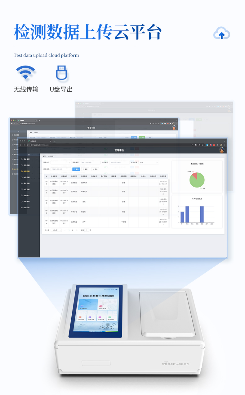 云平臺:儀器帶有監(jiān)管平臺,連接有線/無線網(wǎng)絡(luò),檢測結(jié)果直接傳輸至環(huán)境安全監(jiān)管平臺。