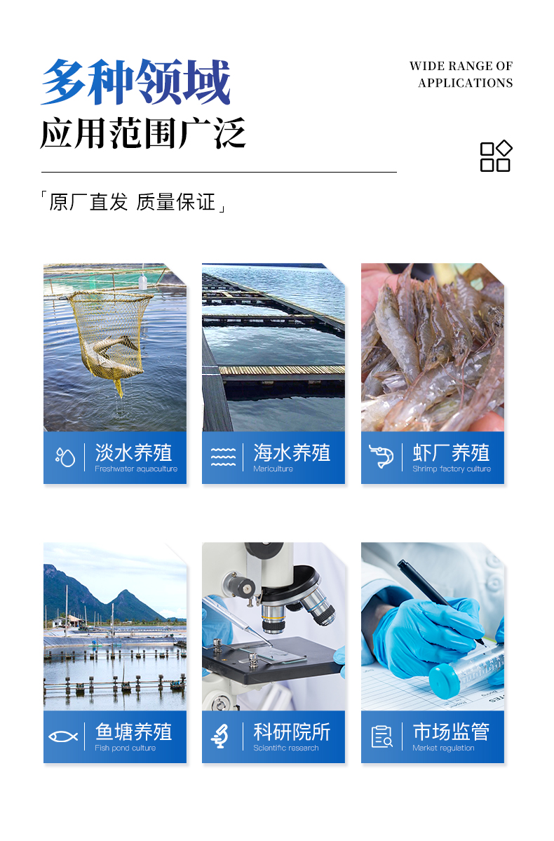 適用于水產(chǎn)養(yǎng)殖、河流監(jiān)測(cè)、生產(chǎn)監(jiān)測(cè)、純凈水廠、自來(lái)水廠、生活污水處理廠、工業(yè)污水、游泳場(chǎng)館、水源保護(hù)、科研實(shí)驗(yàn)等。