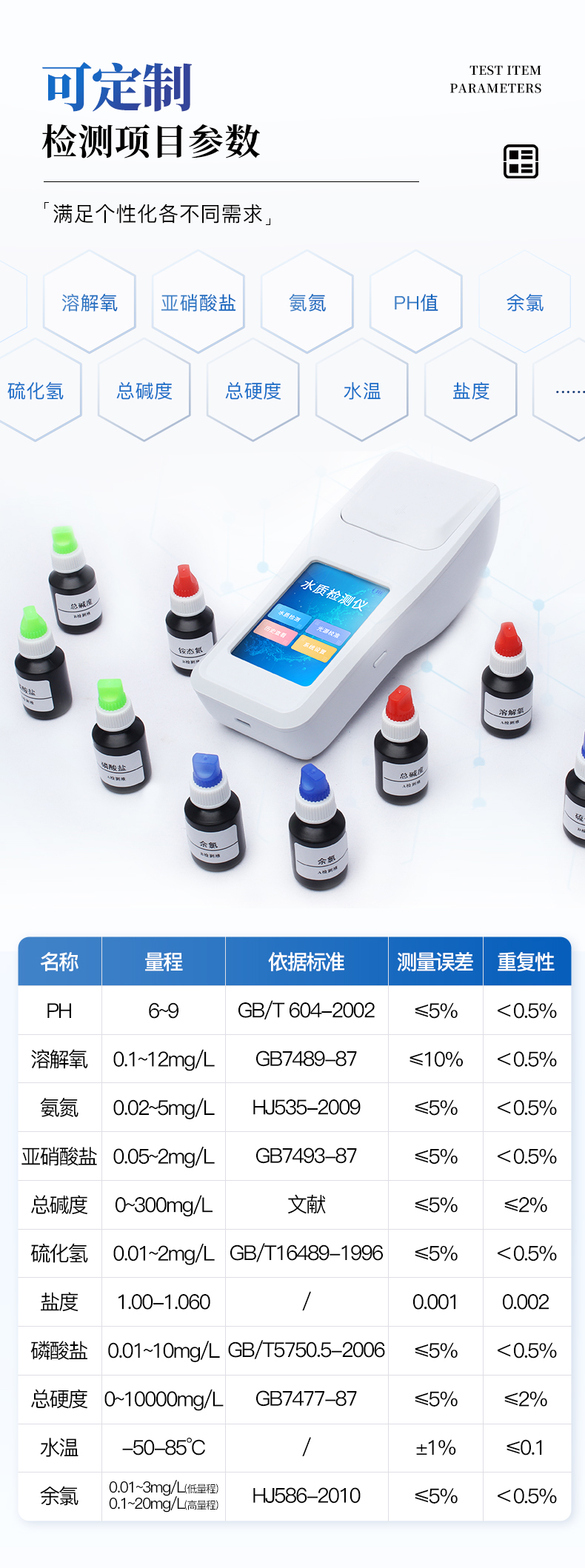 PH、溶解氧、氨氮、亞硝酸鹽、硫化氫、總堿度、檢測(cè)指標(biāo)等