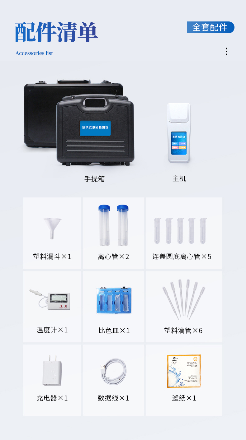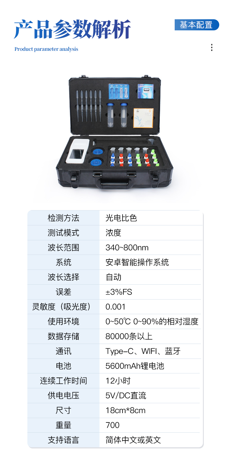 提取一定量水體樣品,經(jīng)過(guò)前處理后根據(jù)不同檢測(cè)項(xiàng)目按照試劑說(shuō)明書滴入檢測(cè)試劑,檢測(cè)試劑會(huì)與水體中的待測(cè)物質(zhì)發(fā)生反應(yīng),反應(yīng)液呈現(xiàn)特定的顏色。