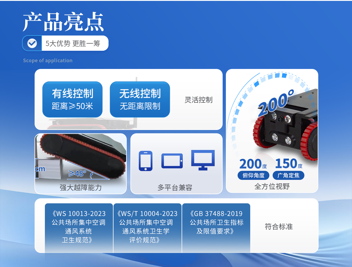 合規(guī)性:完全符合《WS 10013-2023》、《WS/T 10004-2023》及《GB 37488-2019》中對集中空調(diào)定量采樣機(jī)器人的要求。 緊湊設(shè)計:尺寸長寬高310mm * 160mm * 100mm,可進(jìn)入*小尺寸為100×160毫米的矩形鐵皮風(fēng)管內(nèi)部進(jìn)行采樣。 精準(zhǔn)采樣:提供刮拭法和擦拭法兩種采樣方法,采樣器取樣面積50平方厘米,密閉雙采樣器加裝氣流回風(fēng)道,并使用光固化3D打印技術(shù)制造,保障了采樣面積的有效性。布條和擁有專利設(shè)計的刮板夾安裝方便快捷,現(xiàn)場操作時可**限度地杜絕二次污染,實現(xiàn)無菌操作。采樣誤差小于5%,采樣偏差小于3%。 全方位視野:前置攝像頭俯仰角度達(dá)200度,前后均采用150度廣角定焦攝像頭,提供無死角視野。 靈活控制:支持無線與有線兩種控制方式,有線控制距離≥50米,無線控制無距離限制。視頻采集、拍照及機(jī)器人控制均由終端完成。 強(qiáng)大越障能力:越障礙高度≥7cm,爬坡角度≥48度,整機(jī)含電池工作重量僅為4.0KG。 全自動采樣:軟件控制加入了《集塵量采樣》與《微生物采樣》的全自動一鍵采樣功能,無需人工干預(yù)即可完成所有采樣動作。 耐用材質(zhì):整機(jī)不低于95%的材料使用航空鋁合金,表面經(jīng)過氧化噴砂處理并增厚鈍化膜,增加表面硬度。機(jī)體行走模塊一體成型,總重不超過4KG。 多平臺兼容:支持安卓系統(tǒng)、鴻蒙系統(tǒng)的手機(jī)、平板、電腦進(jìn)行控制操作。 **續(xù)航:配備4000mAh容量的動力電池,充電時間≤4小時,單次充電后可持續(xù)運行約5-6小時。