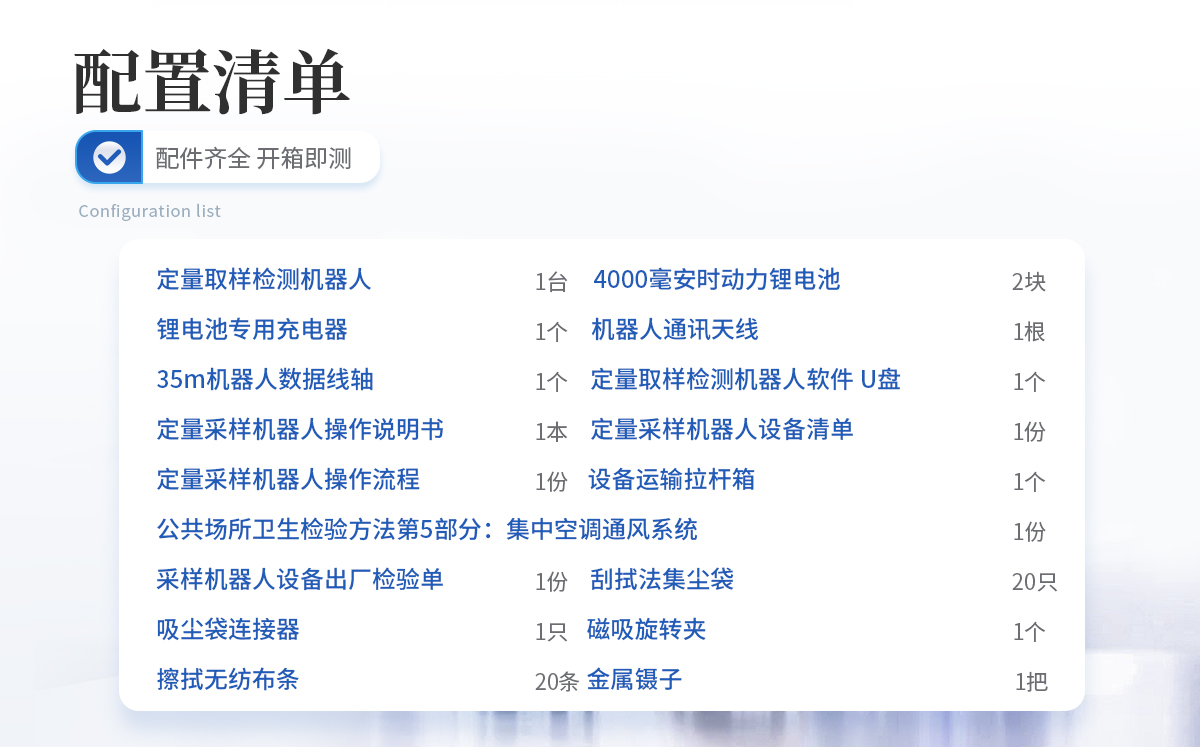 定量取樣檢測機(jī)器人:1臺 4000毫安時動力鋰電池:2塊 鋰電池專用充電器:1個 機(jī)器人通訊天線:1根 35m機(jī)器人數(shù)據(jù)線軸:1個 定量取樣檢測機(jī)器人軟件 U盤:1個 定量采樣機(jī)器人操作說明書:1本 定量采樣機(jī)器人設(shè)備清單:1份 定量采樣機(jī)器人操作流程:1份 公共場所衛(wèi)生檢驗方法第5部分:集中空調(diào)通風(fēng)系統(tǒng):1份 采樣機(jī)器人設(shè)備出廠檢驗單:1份 刮拭法集塵袋 :20只 吸塵袋連接器 :1只 磁吸旋轉(zhuǎn)夾:1個 擦拭無紡布條 :20條 金屬鑷子:1把 設(shè)備運輸拉桿箱:1個