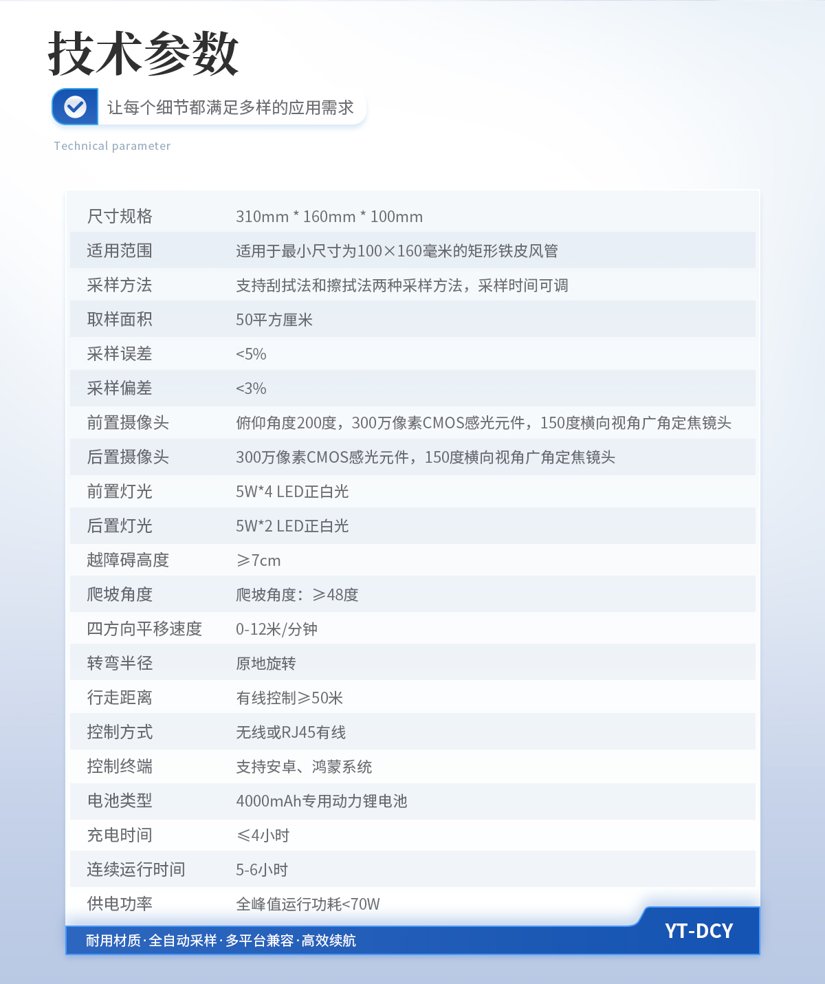 尺寸規(guī)格:310mm * 160mm * 100mm; 適用范圍:適用于*小尺寸為100×160毫米的矩形鐵皮風(fēng)管; 采樣方法:支持刮拭法和擦拭法兩種采樣方法,采樣時間可調(diào); 取樣面積:50平方厘米; 采樣誤差:<5%; 采樣偏差:<3%; 前置攝像頭:俯仰角度200度,300萬像素CMOS感光元件,150度橫向視角廣角定焦鏡頭; 后置攝像頭:300萬像素CMOS感光元件,150度橫向視角廣角定焦鏡頭; 前置燈光:5W*4 LED正白光; 后置燈光:5W*2 LED正白光; 越障礙高度:≥7cm; 爬坡角度:≥48度; 四方向平移速度:0-12米/分鐘; 轉(zhuǎn)彎半徑:原地旋轉(zhuǎn); 行走距離:有線控制≥50米; 控制方式:無線或RJ45有線; 控制終端:支持安卓、鴻蒙系統(tǒng); 電池類型:4000mAh專用動力鋰電池; 充電時間:≤4小時; 連續(xù)運行時間:5-6小時; 供電功率:全峰值運行功耗<70W;