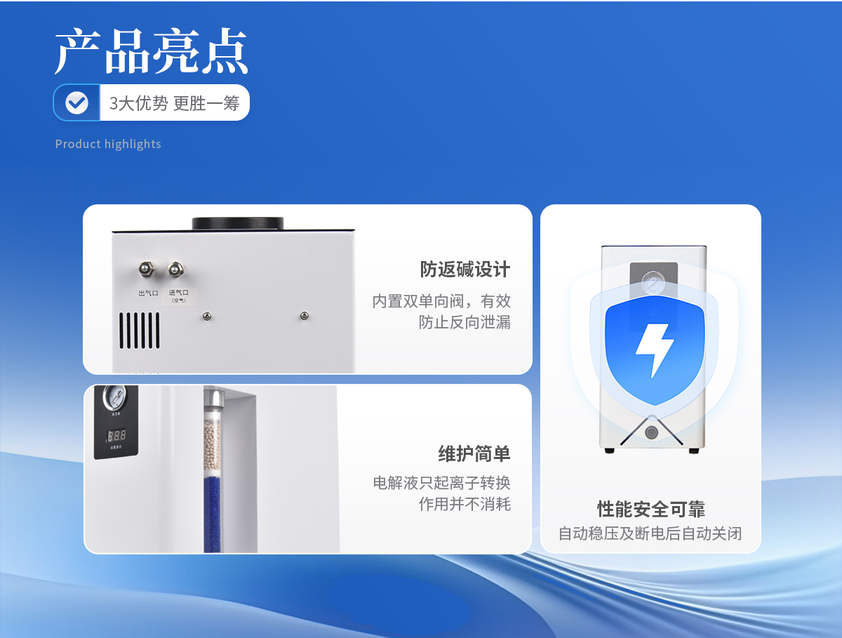 1、可取代高壓氮?dú)馄?,使?shí)驗(yàn)室儀器化。 2、操作簡便,只需啟動(dòng)電源開關(guān),儀器即可產(chǎn)氮且輸出壓力穩(wěn)定。 3、不消耗電解液;電解液只起離子轉(zhuǎn)換作用并不消耗,所以只需補(bǔ)充因蒸發(fā)而損失的少量蒸餾水。 4、產(chǎn)氣純度高,空氣經(jīng)電解池分離后即可得到高純氮?dú)狻? 5、性能安全可靠:具有穩(wěn)壓和斷電后自動(dòng)關(guān)閉氣路功能。 6、壽命長,既可間斷使用,又可連續(xù)使用且產(chǎn)氣量穩(wěn)定、不衰減。 7、**節(jié)能:采用**的開關(guān)電源,提高了電解效率。 8、配有雙單向閥,自動(dòng)防返堿。