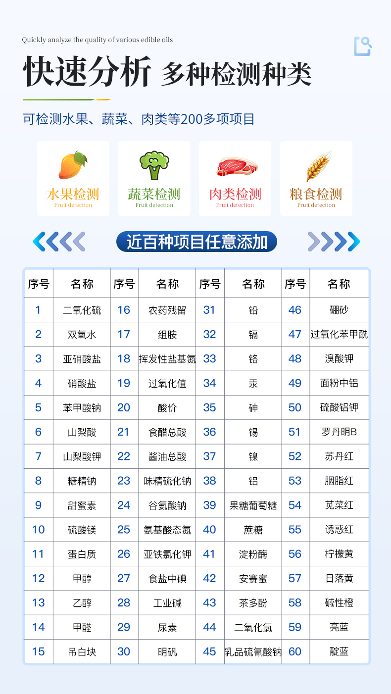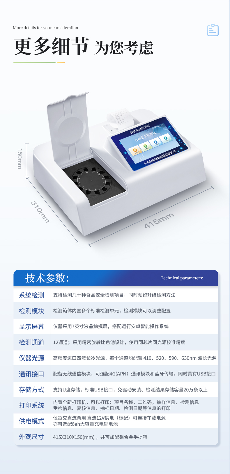 | 1、儀器采用臺(tái)式一體化系統(tǒng)檢測技術(shù),將分光光度模塊、數(shù)字化管理模塊、無線通訊模塊高度集成于一體,支持檢測幾十種食品安全檢測項(xiàng)目,同時(shí)預(yù)留升級(jí)檢測方法。 | 2、儀器檢測模塊標(biāo)準(zhǔn)化、智能化,檢測項(xiàng)目可隨意自由組合。檢測箱體內(nèi)置多個(gè)標(biāo)準(zhǔn)檢測單元,檢測模塊可以調(diào)整配置。 | 3、顯示屏幕:儀器采用7英寸液晶觸摸屏,搭配運(yùn)行安卓智能操作系統(tǒng),主控芯片采用ARM Cortex-A7,RK3288/4核處理器,主頻1.88Ghz,操作方便,性能更強(qiáng)。 | 4、檢測通道:≥12通道;采用精密旋轉(zhuǎn)比色池設(shè)計(jì),使用同芯片同光源校準(zhǔn)精度,解決不同光源之間的誤差值,更加準(zhǔn)確**。 | 5、儀器光源:高精度進(jìn)口四波長冷光源,每個(gè)通道均配置 410、520、590、630nm 波長光源,標(biāo)配**的光路切換裝置,專利光路切換功能可實(shí)現(xiàn)64波長,并且所有檢測項(xiàng)目可實(shí)現(xiàn)所有通道同時(shí)檢測。 | 6、通訊接口:配備無線通信模塊、可選配4G(APN)通訊模塊和藍(lán)牙傳輸,同時(shí)具有USB接口,可以多方式實(shí)現(xiàn)數(shù)據(jù)保存及數(shù)據(jù)傳輸。 | 7、存儲(chǔ)方式:支持U盤存儲(chǔ),標(biāo)準(zhǔn)USB接口,免驅(qū)動(dòng)安裝。檢測結(jié)果存儲(chǔ)容量20萬條以上,可生成Excel表格進(jìn)行拷貝,并具有登錄保護(hù)功能。 | 8、智能化操作系統(tǒng): | 8.1、操作系統(tǒng):儀器可在同一檢測界面自動(dòng)對(duì)應(yīng)相關(guān)檢測通道,一次性選擇1-12個(gè)樣品名稱,無需退出界面,節(jié)省操作時(shí)間。并可以對(duì)每個(gè)通道屬性和樣品信息單獨(dú)進(jìn)行編輯,例如送檢單位、人員,檢測人員等,打印時(shí)勾選打印顯示。 | 8.2、限量規(guī)判系統(tǒng):具有限量查詢、添加物質(zhì)合規(guī)判定系統(tǒng)。檢測出結(jié)果后,系統(tǒng)自動(dòng)調(diào)用系統(tǒng)數(shù)據(jù)庫中相關(guān)國標(biāo)進(jìn)行比對(duì)判定,客觀顯示結(jié)果是否合格。 | 8.3、數(shù)據(jù)監(jiān)管系統(tǒng):同步對(duì)接監(jiān)管平臺(tái),數(shù)據(jù)可局域網(wǎng)和互聯(lián)網(wǎng)數(shù)據(jù)上傳,檢測結(jié)果可選擇直接傳至食品安全監(jiān)管平臺(tái)。進(jìn)行區(qū)域食品安全監(jiān)管及大數(shù)據(jù)分析處理與數(shù)據(jù)統(tǒng)計(jì),檢測區(qū)域食品安全長短期動(dòng)態(tài),達(dá)到食品安全問題預(yù)估、預(yù)警。 | 8.4、打印系統(tǒng):內(nèi)置全新打印機(jī),可以打印:項(xiàng)目名稱,二維碼,抽樣信息、檢測信息,受檢信息、復(fù)核信息、抽樣日期、檢測日期等信息的打印。 | 9、供電模式:儀器交直流兩用,直流12V供電(標(biāo)配),可連接車載電源,亦可選配6ah大容量充電鋰電池,電量可實(shí)時(shí)顯示,方便戶外流動(dòng)測試。 | 10、儀器具有重新校準(zhǔn)、鎖定、恢復(fù)出廠設(shè)置功能, | 11、外觀尺寸:415X310X150(mm) ,并可加配鋁合金手提箱 |