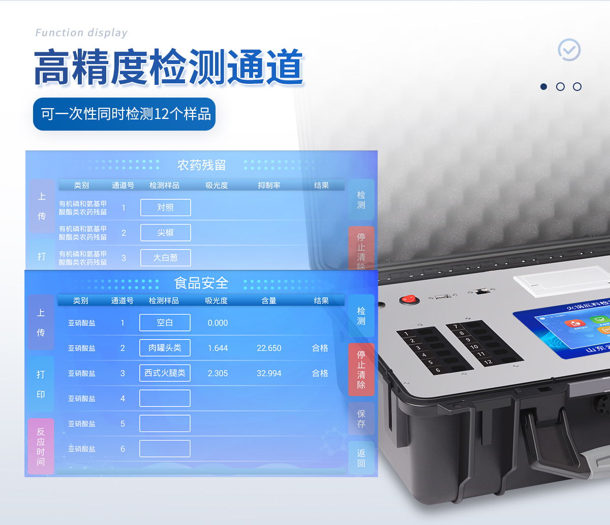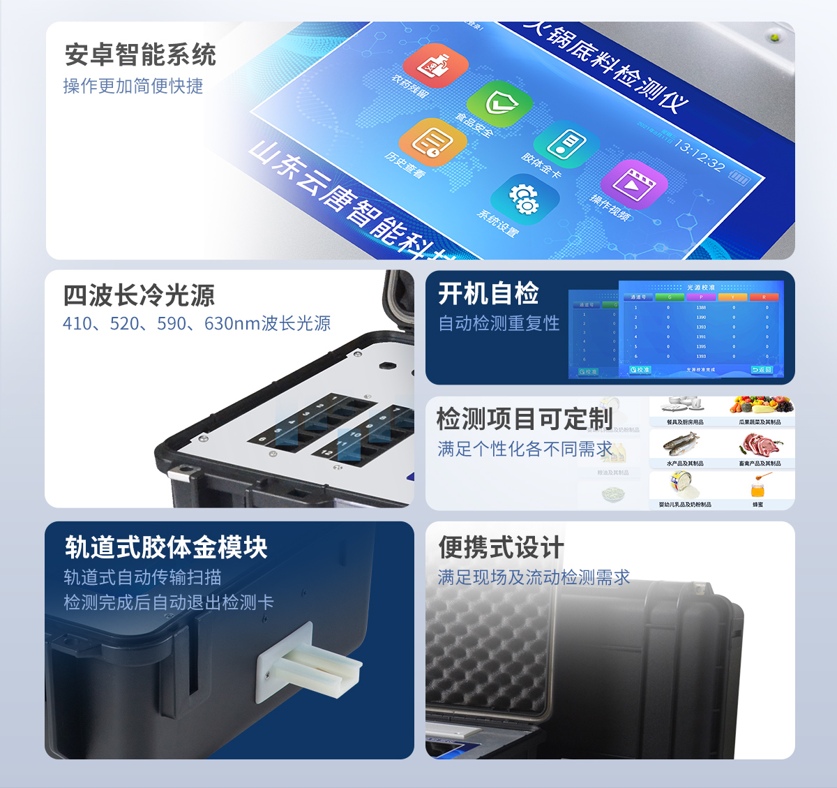 5、一體化便攜式快檢設(shè)備,滿足現(xiàn)場及流動(dòng)檢測使用需求,能夠在同一軟件下實(shí)現(xiàn)所有檢測項(xiàng)目的檢測,并可通過同一窗口直觀顯示檢測結(jié)果。