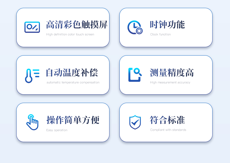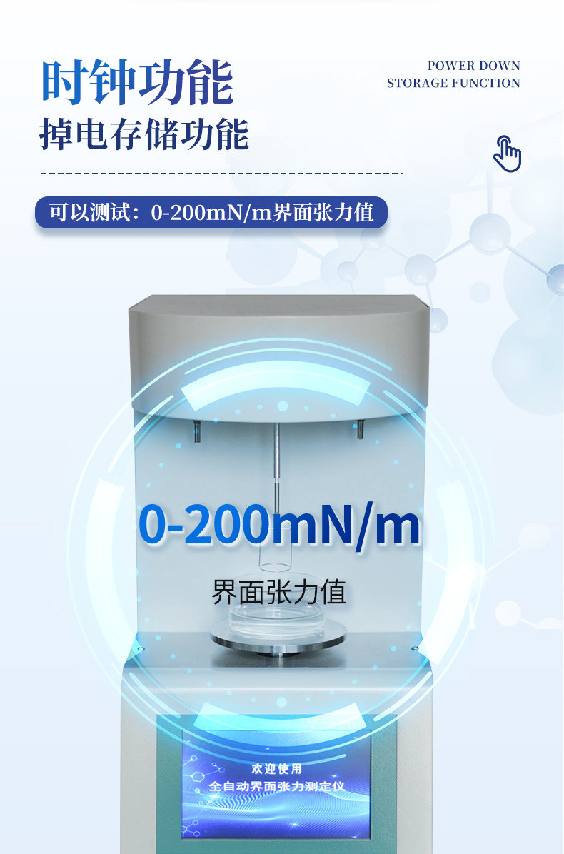 | 儀器采用等一點標(biāo)定,簡單方便,保證測量精度; | 自動溫度補償;動態(tài)張力曲線顯示; | 時鐘功能,掉電存儲功能; | 高清晰彩色觸摸屏,操作更加方便; |