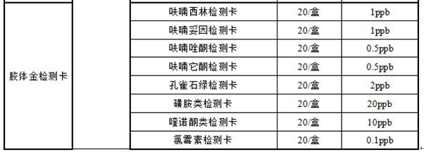水產(chǎn)品的安全隱患主要是在養(yǎng)殖過程中藥物的過量使用及加工過程中添加劑的違規(guī)使用。食用水產(chǎn)品中對食品安全造成危害的藥物主要有:呋喃代謝物、四環(huán)素、環(huán)丙沙星等抗生素藥物殘留。公司針對市場上常見的水產(chǎn)品中藥物殘留開發(fā)對應(yīng)的檢測試劑盒及膠體金檢測卡如下表: