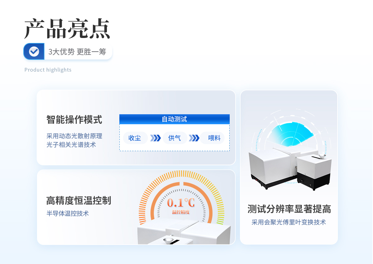 | 高測(cè)試分辨率 :采用會(huì)聚光傅里葉變換技術(shù),不僅克服了透鏡孔徑對(duì)散射角的限制,在有限的空間內(nèi)實(shí)現(xiàn)量程的大范圍擴(kuò)展,并添加多個(gè)輔助集成光電探測(cè)器,能有效采集測(cè)試量程所對(duì)應(yīng)的各個(gè)角度的散射光,實(shí)現(xiàn)全量程內(nèi)的測(cè)試準(zhǔn)確度和可靠性。 | 科學(xué)合理的干法分散系統(tǒng) :采用紊流分散技術(shù),利用激波的剪切效果,使顆粒樣品達(dá)到充分的分散,分散系統(tǒng)關(guān)鍵部位采用耐磨陶瓷,不僅提高了使用壽命,而且還保證測(cè)試結(jié)果更加準(zhǔn)確和穩(wěn)定。 | 智能操作模式 :具有智能化全自動(dòng)操作方式,實(shí)現(xiàn)一鍵測(cè)試,即只要加入樣品,啟動(dòng)儀器控制面板上的“自動(dòng)測(cè)試”鍵,所有儀器的操作過(guò)程包括收塵、供氣、喂料全部自動(dòng)完成,操作者只需操作計(jì)算機(jī)即可,不僅減小了操作者的工作量,更重要的是消除了因人為因素而造成的誤差,進(jìn)一步提高了測(cè)試精度和結(jié)果的真實(shí)性。 | 頻譜放大技術(shù) :增強(qiáng)探頭對(duì)信號(hào)的靈敏度,極大地提高了測(cè)試范圍;運(yùn)用會(huì)聚光傅里葉變換技術(shù),使得大角度散射光不受透鏡孔徑的限制,有效提高了儀器的分辨能力。 |