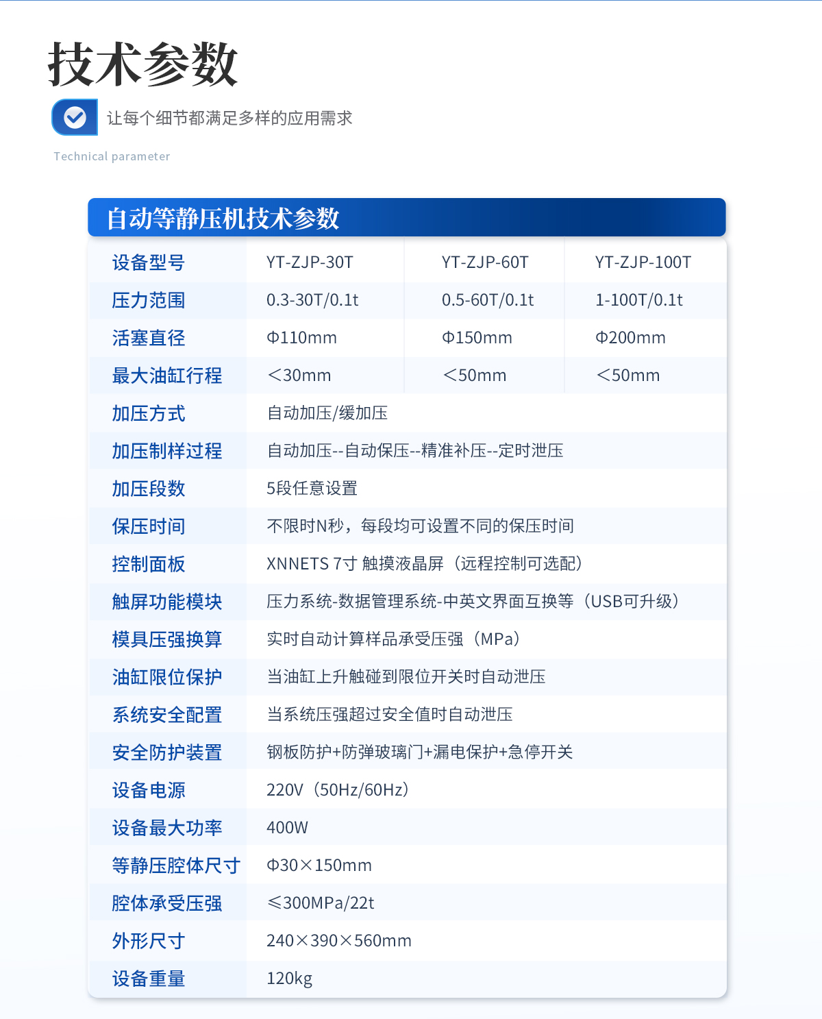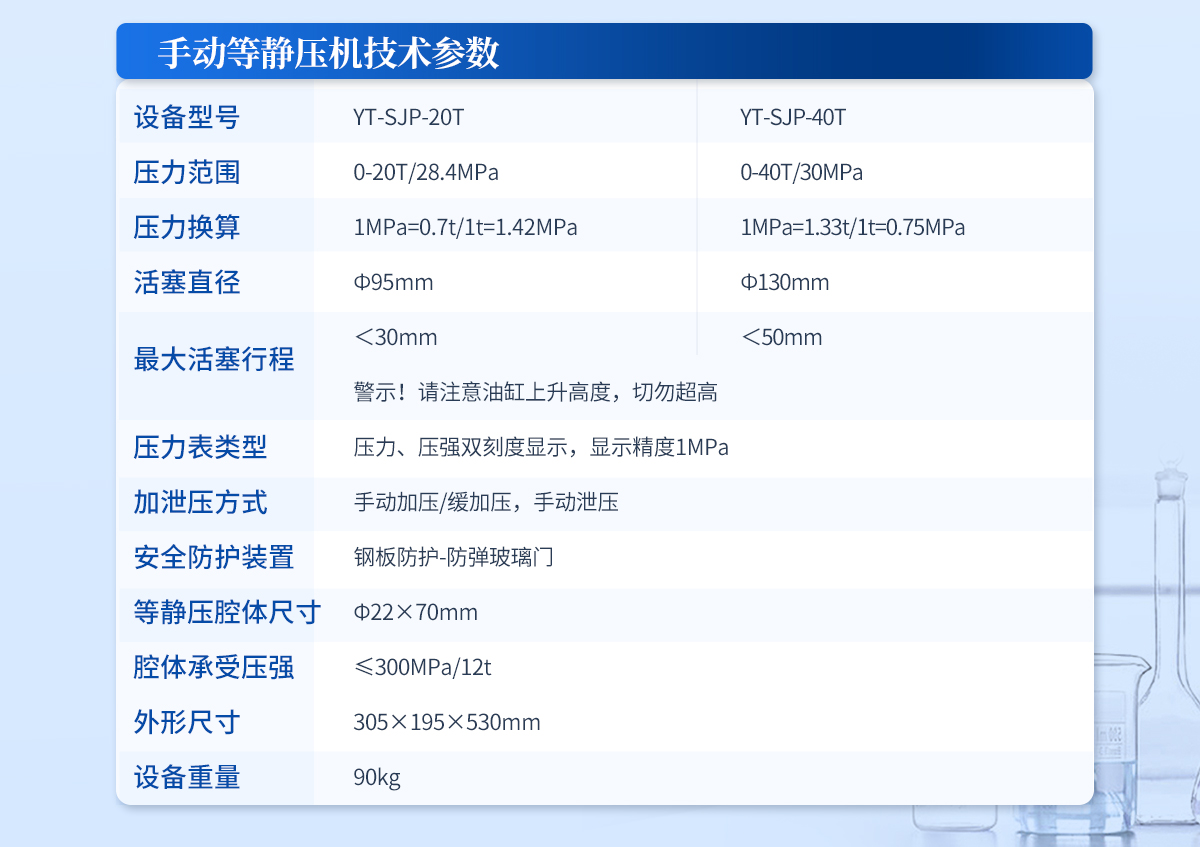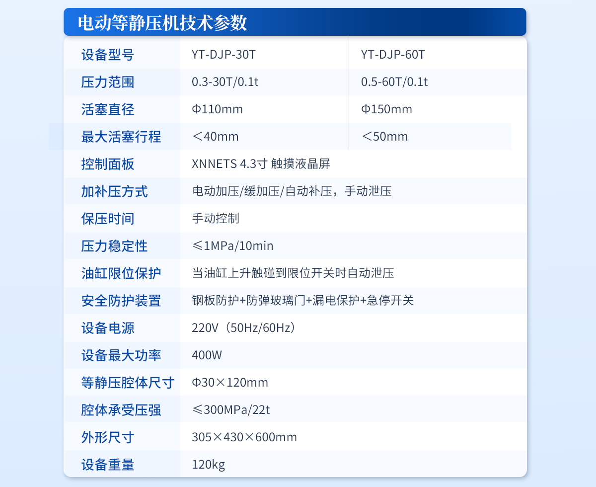 | 規(guī)格型號:YT-ZJP-30T | 壓力范圍:0.3-30T/0.1t | 活塞直徑 :Φ110mm | **油缸行程:<30mm | 加壓方式:自動加壓/緩加壓 | 加壓制樣過程:自動加壓--自動保壓--精準補壓--定時泄壓 | 加壓段數(shù):5段任意設置 | 保壓時間 :不限時N秒,每段均可設置不同的保壓時間 | 控制面板:XNNETS 7寸 觸摸液晶屏(遠程控制可選配) | 觸屏功能模塊:壓力系-統(tǒng)-數(shù)據(jù)管理系統(tǒng)--中英文界面互換等(USB可升級) | 模具壓強換算:實時自動計算樣品承受壓強(MPa) | 油缸限位保護:當油缸上升觸碰到限位開關時自動泄壓 | 系統(tǒng)安全配置:當系統(tǒng)壓強超過安全值時自動泄壓 | 安全防護裝置:鋼板防護+防彈玻璃門+漏電保護+急停開關 | 設備電源:220V(50Hz/60Hz) | 設備**功率:400W | 等靜壓腔體尺寸:Φ30×150mm | 腔體承受壓強:≤300MPa/22t | 外形尺寸:240×390×560mm | 設備重量:120kg | 配置說明:等靜壓機1臺!可根據(jù)需求定制500MPa等靜壓機或橡膠模具 |