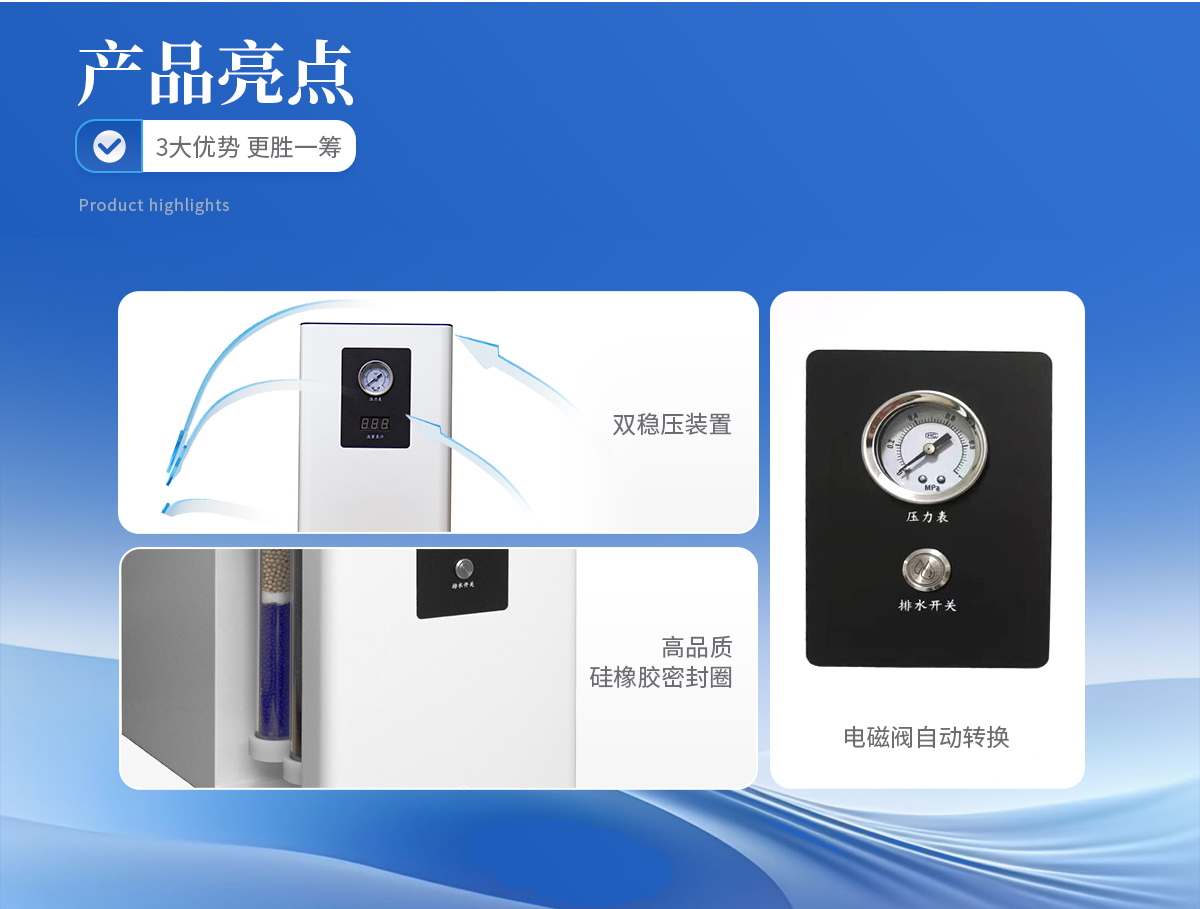 1、雙穩(wěn)壓裝置,確保高精度穩(wěn)壓條件下氣體流量的穩(wěn)定性。 2、電磁閥自動轉換,徹底杜絕了電磁閥在自動放水時產生的連續(xù)噪音,實現放水、轉換一體化。 3、儀器內部采用硅橡膠圈,含硫量低有效提高氣體質量,保證色譜基線穩(wěn)定。 4、體積小,雙支FV型亞克力過濾器,耐壓高,不會因工作環(huán)境及腐蝕氣體的影響,導致過濾管變形,開裂而產生漏氣現象,可持久使用,一勞永逸。