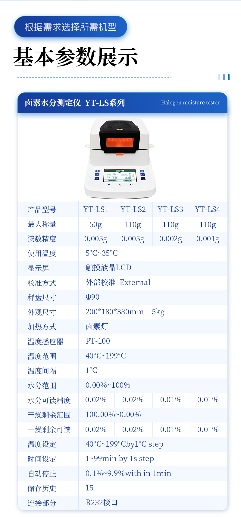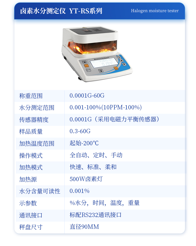 | 型號 :YT-RS120A,**稱量值:120g ,顯示分度值:0.001g,可 讀 性 :0.01% | 型號 : YT-RS120B,**稱量值:120g ,顯示分度值: 0.002g ,可 讀 性 :0.01% | 型號 : YT-RS50A,**稱量值:120g ,顯示分度值: 0.005g ,可 讀 性 :0.01% | 型號 : YT-RS60A,**稱量值:120g ,顯示分度值: 0.01g ,可 讀 性 :0.1% | 加 熱 源 鹵素?zé)? 溫度設(shè)置 室溫- 180℃ | 數(shù)據(jù)保存 16組 重量校準(zhǔn) 100g | 稱盤尺寸 φ110 (mm) | 外形尺寸 (D*W*H)330*205*165(mm) | 包裝尺寸 (D*W*H)410*315*335 (mm) | 凈 重 3.2kg 毛 重 4.6kg |