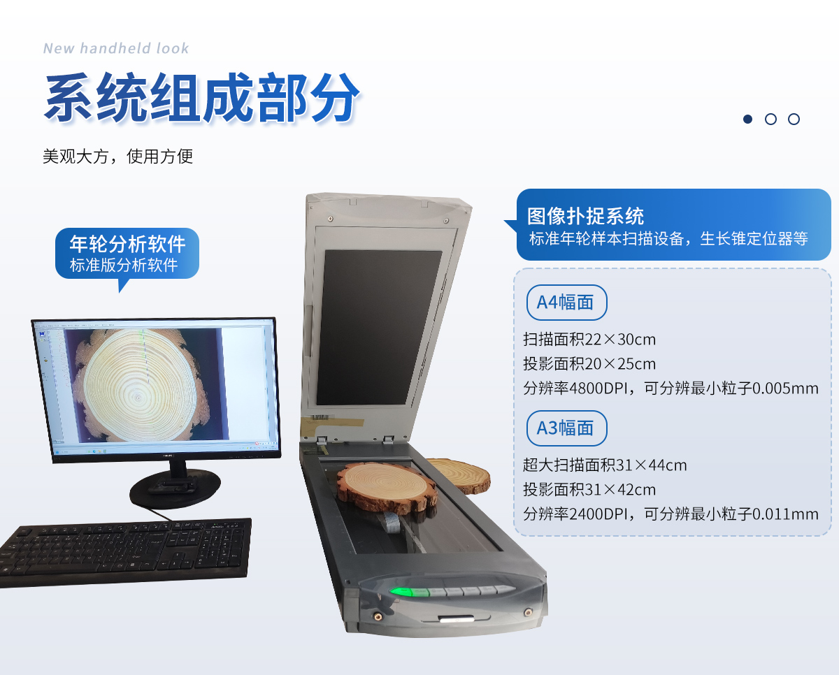 圖像撲捉系統(tǒng):標(biāo)準(zhǔn)年輪樣本掃描設(shè)備,生長(zhǎng)錐定位器等。 A4幅面:掃描面積22×30cm,投影面積20×25cm,分辨率4800DPI,可分辨*小粒子0.005mm A3幅面:超大掃描面積31×44cm,投影面積31×42cm,分辨率2400DPI,可分辨*小粒子0.011mm 年輪分析軟件:標(biāo)準(zhǔn)版分析軟件。