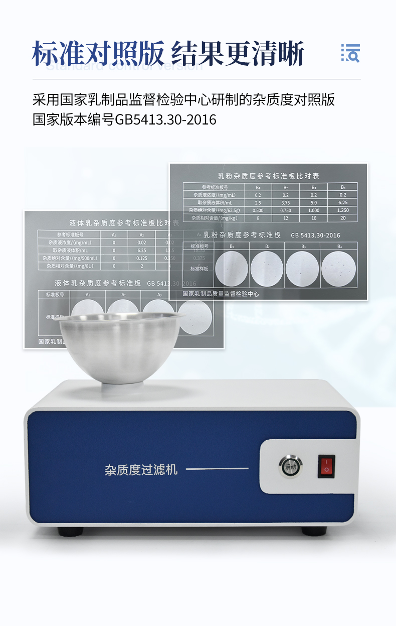 | 用途:用于乳及乳制品中雜質(zhì)度的測(cè)定。 | 標(biāo)準(zhǔn)依據(jù):符合國(guó)家標(biāo)準(zhǔn) GB/T5413.1—5413.32,特別是 GB5413.30-2016 的要求。 |