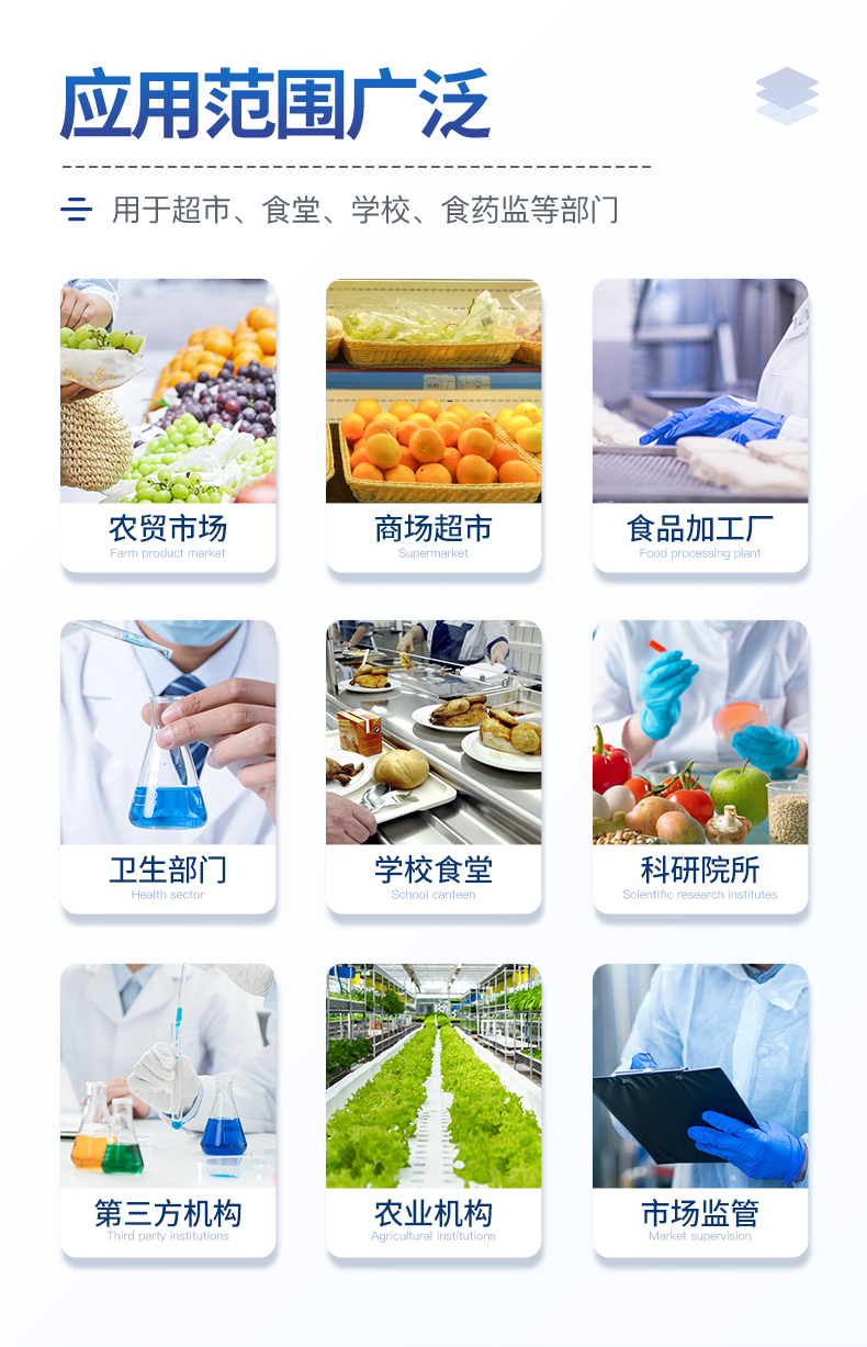 廣泛應(yīng)用于主要用于蔬菜、水果、茶葉、糧食、農(nóng)副產(chǎn)品等食品中有機(jī)磷和氨基甲酸酯類農(nóng)藥殘留的快速檢測(cè);此外還可用于果蔬茶生產(chǎn)基地和農(nóng)貿(mào)批發(fā)銷售市場(chǎng)現(xiàn)場(chǎng)檢測(cè),餐館、學(xué)校、食堂、家庭果蔬加工前的安全速測(cè)等。