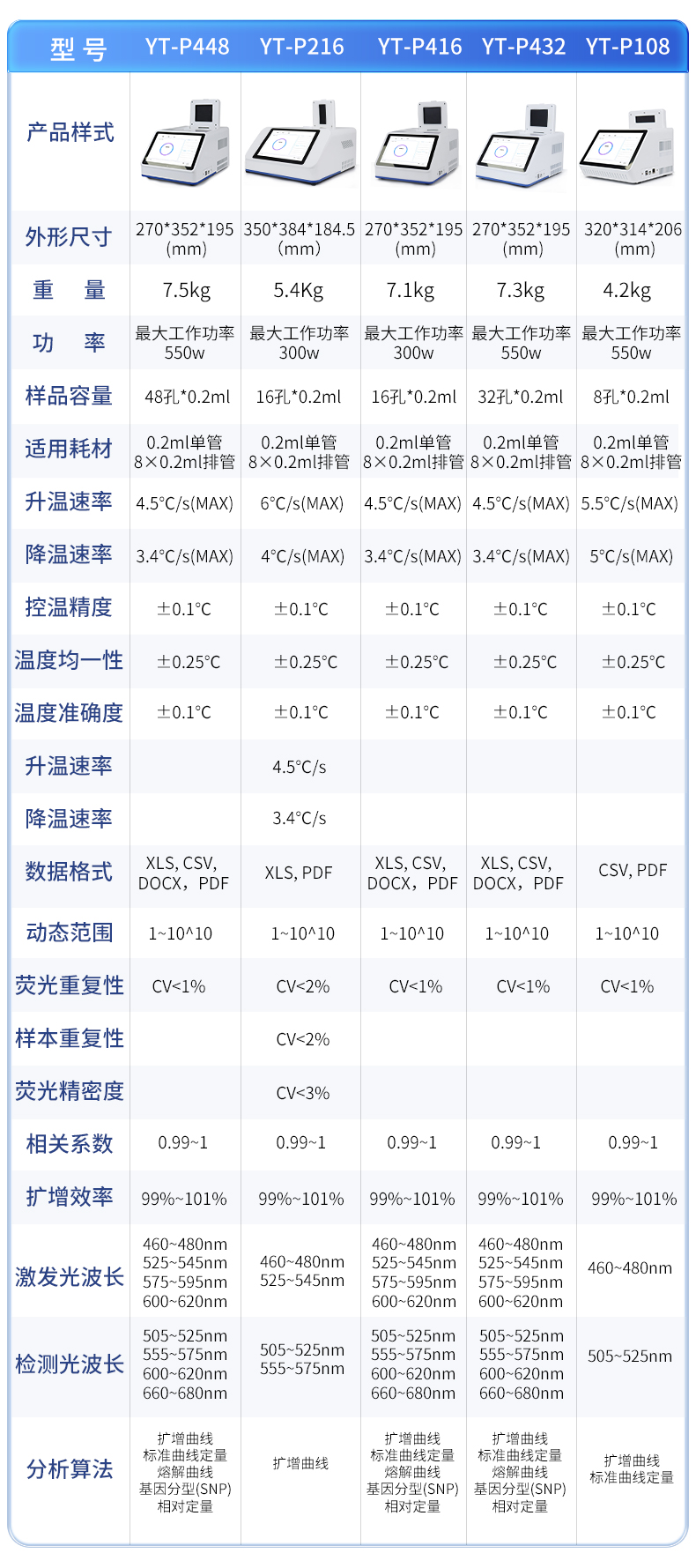 | 基本性能 | 外形尺寸:270*352*195 (mm) | 重量:7.5kg | 電源:220V | 功率:**工作功率550w | 操作系統(tǒng):自帶Android操作系統(tǒng) | 外接電腦:外接windows電腦(win7系統(tǒng)以上) | 系統(tǒng)語言:中英文實(shí)時切換 | 通信接口:方形USB | 操作環(huán)境參數(shù) | 操作環(huán)境溫度:18~35℃ | 操作環(huán)境相對濕度:0%~85% | 運(yùn)輸及儲存溫度:-20~55℃ | 運(yùn)輸及儲存相對濕度:0%~85% | 系統(tǒng)性能 | 樣品容量:48孔*0.2ml | 樣品容積:15~100ul | 適用耗材:0.2ml單管、8×0.2ml排管 | 控溫范圍:4~99℃ | 熱蓋溫度:30℃-108℃(默認(rèn)105℃,熱蓋溫度可調(diào)) | 溫控方式:高性能進(jìn)口半導(dǎo)體 | 梯度控溫:3模塊梯度控溫,**溫差支持35℃ | 升溫速率:4.5℃/s(MAX) | 降溫速率:3.4℃/s(MAX) | 控溫精度:±0.1℃ | 溫度均一性 :±0.25℃ | 溫度準(zhǔn)確度 :±0.1℃ | 操作功能:預(yù)設(shè)項(xiàng)目和分析參數(shù),操作簡單方便 | 報告:支持報告自定義模塊,48孔分項(xiàng)目打印 | 分析功能:具多重qPCR數(shù)據(jù)分析功能,可同時檢測4個檢測通道 | 斷電保護(hù):可以一鍵重啟中斷的實(shí)驗(yàn) | 儀器信息:擁有故障記錄,分析,提示的功能,更方便遠(yuǎn)程解決問題 | 分析算法:擴(kuò)增曲線,標(biāo)準(zhǔn)曲線定量、熔解曲線,基因分型(SNP),相對定量 | 支持HRM檢測:支持 | 數(shù)據(jù)導(dǎo)出:可將實(shí)驗(yàn)結(jié)果以圖形和表格的形式直接導(dǎo)出;詳細(xì)的數(shù)據(jù)報告內(nèi)容包括實(shí)驗(yàn)條件,數(shù)據(jù)坐標(biāo)和表格,數(shù)據(jù)分析參數(shù)。 | 數(shù)據(jù)格式:XLS, CSV, DOCX,PDF | TouchDown功能:支持時間和溫度遞增遞減模式 | 熒光檢測系統(tǒng)性能 | 檢測靈敏度:可檢測單拷貝基因 | 動態(tài)范圍:1~10^10 | 熒光重復(fù)性:CV<1%(使用某品牌試劑做48孔均一性實(shí)驗(yàn),48個孔的Ct差值保持在0.5以內(nèi),CV保持在1%以內(nèi)。) | 相關(guān)系數(shù):0.99~1(每種濃度3個重復(fù),梯度曲線的相關(guān)系數(shù)>0.99,擴(kuò)增效率保持在99%~101%之間) | 擴(kuò)增效率:99%~101% | 可信度:區(qū)分1000與2000拷貝濃度差異 | 激光光源:大功率LED(免維護(hù),壽命長) | 檢測器:高靈敏度光電傳感器 | 激發(fā)和檢測傳播介質(zhì):耐高溫專業(yè)導(dǎo)光光纖 | 激發(fā)光波長:460nm~480nm , 525nm~545nm, 575nm~595nm ,600nm~620nm | 檢測光波長:505nm~525nm , 555nm~575nm , 600nm~620nm , 660nm~680nm |