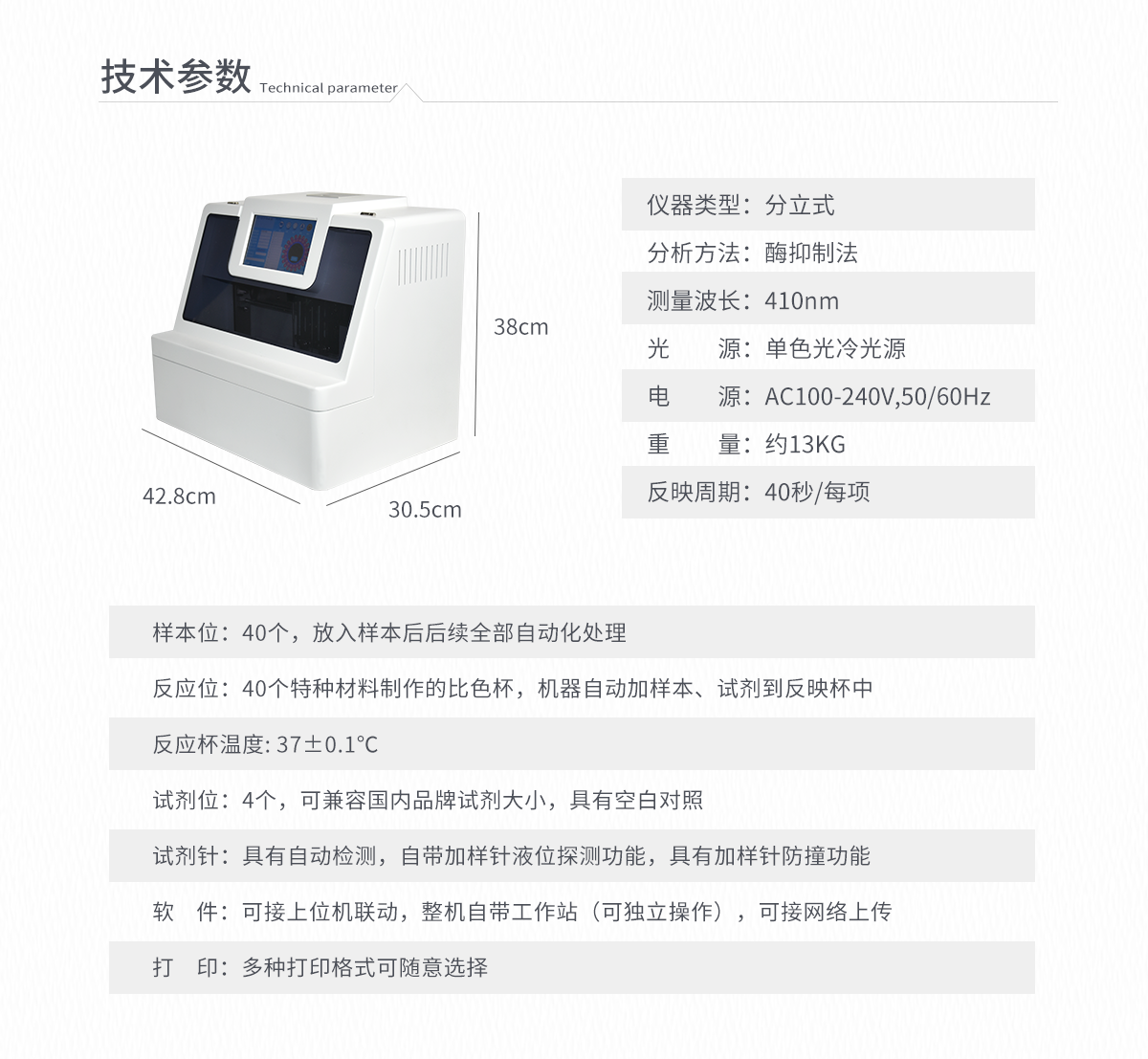 | 波長配置:410 | 試 劑 針:3根 | 檢測通道:20個 | 反應(yīng)溫度:37℃,儀器具有自動加溫溫控系統(tǒng) | 觸 摸 屏:7寸觸摸屏,可單機操作 | 比 色 皿:容量 0 - 4.5ml | 試 劑 盒:配套試劑存放盒,可整體取出 | 清洗功能:可自動清洗試劑管路,避免試劑污染 | 加樣功能:儀器按照試劑要求自動、按時、按量加入試劑,提高工作效率 | 自動混勻:儀器測試過程中自動震蕩混勻保證試劑充分反應(yīng) | 實時監(jiān)控:儀器測試過程中顯示實時運行狀態(tài) | 打印功能:內(nèi)置熱敏打印機,可快速打印檢測結(jié)果,方便數(shù)據(jù)留存 | 數(shù)據(jù)存儲:大容量存儲器,能存儲12萬條數(shù)據(jù) | 數(shù)據(jù)接口:外接USB接口,網(wǎng)線接口 | 網(wǎng)絡(luò)連接:可連接有線網(wǎng)絡(luò)和無線wifi | 上位機軟件:儀器配套電腦端上位機軟件,可通過軟件進行寫入?yún)?shù)及讀取數(shù)據(jù) | 樣本檢測:儀器自動對未正常放置的樣本或異常的樣本進行檢查并報警提示 | 試劑檢測:儀器測試前和測試過程中時刻對試劑進行檢查,檢查試劑是否缺失,如有異常儀器會進行報警提示,對已經(jīng)加入試劑的樣本進行正常測試,不影響測試結(jié)果,對未測試的樣本停止測試。 | 數(shù)據(jù)上傳:儀器數(shù)據(jù)可傳入電腦端,按照客戶需求進行保存或打印 | 儀器重量:約7KG | 儀器尺寸:410mm*290mm*202mm |