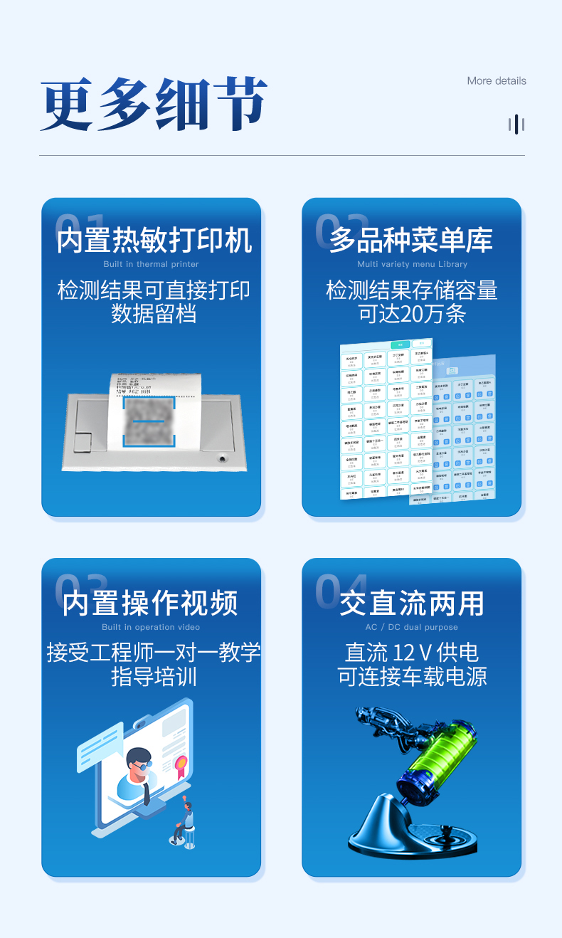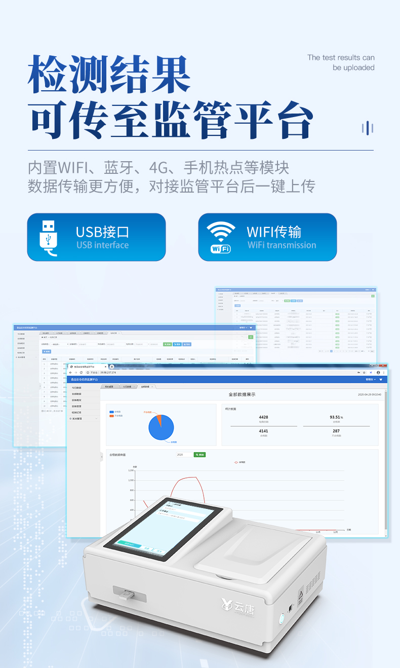 | 儀器采用手提一體化系統(tǒng)檢測(cè)技術(shù),將分光光度模塊、數(shù)字化管理模塊、無(wú)線通訊模塊高度集成于一體,可支持檢測(cè)60種食品安全檢測(cè)項(xiàng)目,同時(shí)預(yù)留升級(jí)檢測(cè)方法。 | 儀器檢測(cè)模塊標(biāo)準(zhǔn)化、智能化,檢測(cè)項(xiàng)目可隨意自由組合。檢測(cè)箱體內(nèi)置多個(gè)標(biāo)準(zhǔn)檢測(cè)單元,檢測(cè)模塊可以調(diào)整配置。 | 顯示屏幕:儀器采用10.1英寸豎向液晶觸摸屏顯,搭配運(yùn)行安卓智能操作系統(tǒng),主控芯片采用ARM Cortex-A7,RK3288/4核處理器,主頻1.88Ghz,操作方便,性能更強(qiáng)。 | 檢測(cè)通道:≥12通道;采用精密旋轉(zhuǎn)比色池設(shè)計(jì),使用同芯片同光源校準(zhǔn)精度,解決不同光源之間的誤差值,更加準(zhǔn)確**。(1-12通道間誤差0.1%,***:**202022821055.2) | 儀器光源:高精度進(jìn)口四波長(zhǎng)冷光源,每個(gè)通道均配置 410、520、590、630nm 波長(zhǎng)光源,標(biāo)配**的光路切換裝置,專利光路切換功能可實(shí)現(xiàn)64波長(zhǎng),并且所有檢測(cè)項(xiàng)目可實(shí)現(xiàn)所有通道同時(shí)檢測(cè)。 | 設(shè)備可一鍵校準(zhǔn),自動(dòng)保存校準(zhǔn)數(shù)據(jù),自動(dòng)對(duì)比校驗(yàn),得到精準(zhǔn)光源,采用Android SP存儲(chǔ)數(shù)據(jù),光源數(shù)據(jù)永不丟失,方便每一次使用。 | 通訊接口:配備無(wú)線通信模塊、4G(APN)通訊模塊、藍(lán)牙傳輸,同時(shí)具有雙USB接口以及RJ45網(wǎng)線接口,可以多方式實(shí)現(xiàn)數(shù)據(jù)保存及數(shù)據(jù)傳輸。 | 存儲(chǔ)方式:支持U盤存儲(chǔ),標(biāo)準(zhǔn)USB接口,免驅(qū)動(dòng)安裝。檢測(cè)結(jié)果存儲(chǔ)容量20萬(wàn)條以上,可生成Excel表格進(jìn)行拷貝,并具有登錄保護(hù)功能。 | 智能化操作系統(tǒng): | 1、操作系統(tǒng):儀器可在同一檢測(cè)界面自動(dòng)對(duì)應(yīng)相關(guān)檢測(cè)通道,一次性選擇1-12個(gè)樣品名稱,無(wú)需退出界面,節(jié)省操作時(shí)間。并可以對(duì)每個(gè)通道屬性和樣品信息單獨(dú)進(jìn)行編輯,例如送檢單位、人員,檢測(cè)人員等,打印時(shí)勾選打印顯示。 | 2、數(shù)據(jù)集成系統(tǒng):設(shè)備首頁(yè)自動(dòng)匯總分析檢測(cè)數(shù)據(jù),包含:周檢測(cè)數(shù)據(jù)、月檢測(cè)數(shù)據(jù),全部檢測(cè)總數(shù)量,均包含檢測(cè)總數(shù),合格數(shù),不合格數(shù),以及相關(guān)柱形分析圖,各項(xiàng)檢測(cè)數(shù)據(jù)一目了然,無(wú)需電腦查詢,更加快捷直觀。 | 3、數(shù)據(jù)庫(kù)系統(tǒng):十幾項(xiàng)數(shù)據(jù)庫(kù)分類管理儀器:包含項(xiàng)目類型、項(xiàng)目數(shù)據(jù)、檢測(cè)數(shù)據(jù)、歷史記錄、國(guó)標(biāo)信息、曲線信息、采樣信息、檢測(cè)信息、受檢信息、復(fù)核信息、圖表信息、光源校準(zhǔn)信息、打印樣式信息、樣品庫(kù)信息等等,數(shù)據(jù)庫(kù)之間互相協(xié)調(diào)聯(lián)動(dòng)保證數(shù)據(jù)的真實(shí)完整性。同時(shí)產(chǎn)品數(shù)據(jù)庫(kù)以及歷史檢測(cè)記錄支持一鍵檢索功能。 | 4、限量規(guī)判系統(tǒng):具有限量查詢、添加物質(zhì)合規(guī)判定系統(tǒng)。檢測(cè)出結(jié)果后,系統(tǒng)自動(dòng)調(diào)用系統(tǒng)數(shù)據(jù)庫(kù)中相關(guān)國(guó)標(biāo)進(jìn)行比對(duì)判定,客觀顯示判定結(jié)果是否合格。 | 5、項(xiàng)目預(yù)設(shè)系統(tǒng):儀器具有任務(wù)預(yù)設(shè)模塊,一鍵提前預(yù)設(shè),給出方便快捷的新檢測(cè)方案,每一個(gè)任務(wù)分別可以設(shè)置不同的樣品、批次、編號(hào)、來(lái)源、備注、抽樣信息、檢測(cè)信息、受檢信息、復(fù)核信息等更多信息。樣品送檢時(shí)一鍵調(diào)取保存信息,并可多次調(diào)取,大大提高檢測(cè)效率。 | 6、數(shù)據(jù)監(jiān)管系統(tǒng):同步對(duì)接監(jiān)管平臺(tái),數(shù)據(jù)可局域網(wǎng)和互聯(lián)網(wǎng)數(shù)據(jù)上傳,檢測(cè)結(jié)果可選擇直接傳至食品安全監(jiān)管平臺(tái)。進(jìn)行區(qū)域食品安全監(jiān)管及大數(shù)據(jù)分析處理與數(shù)據(jù)統(tǒng)計(jì),檢測(cè)區(qū)域食品安全長(zhǎng)短期動(dòng)態(tài),達(dá)到食品安全問(wèn)題預(yù)估、預(yù)警。 | 7.1、全新打印系統(tǒng):內(nèi)置全新打印機(jī),新創(chuàng)自定義打印方式,可按需靈活勾選控制:二維碼,抽樣信息、檢測(cè)信息,受檢信息、復(fù)核信息、抽樣日期、檢測(cè)日期等信息的打印。 | 7.2、A4紙版本報(bào)告打印功能(可選配):設(shè)備擁有兩種結(jié)果展示方式,可以自動(dòng)生成A4打印模板和小票打印模板兩種樣式,可通過(guò)WiFi及網(wǎng)線等方式鏈接外置打印機(jī)可進(jìn)行打印。 | 供電模式:儀器交直流兩用,直流12V供電,可連接車載電源,可配6ah大容量充電鋰電池,電量可實(shí)時(shí)顯示,方便戶外流動(dòng)測(cè)試。 | 儀器具備遠(yuǎn)程升級(jí)功能,可定向分客戶分儀器更新,開(kāi)機(jī)后自動(dòng)更新,并可持續(xù)性免費(fèi)更新系統(tǒng)版本,無(wú)需像傳統(tǒng)產(chǎn)品返廠更新,節(jié)省時(shí)間及人力成本并避免了物流運(yùn)輸返廠升級(jí)導(dǎo)致設(shè)備損壞的潛在風(fēng)險(xiǎn)。 |