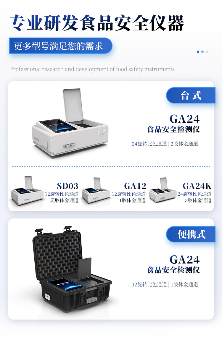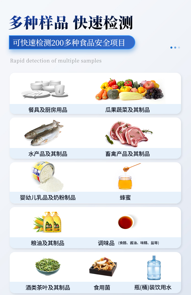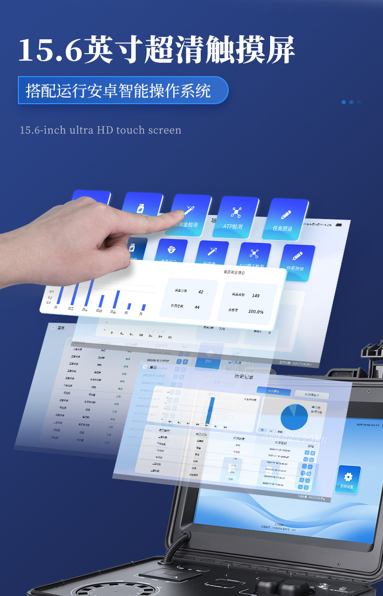 | 1. 功能構(gòu)成:主要包括分光光度模塊、新型農(nóng)殘檢測(cè)模塊、膠體金檢測(cè)模塊、熒光檢測(cè)模塊、數(shù)字化管理模塊等,所有模塊集成一體,可快速檢測(cè)200多種食品安全項(xiàng)目,如獸藥殘留、農(nóng)藥殘留、非法添加劑、細(xì)菌數(shù)值等指標(biāo)。 | 2. 檢測(cè)樣品種類(lèi):餐具及廚房用品、瓜果蔬菜及其制品、水產(chǎn)品及其制品、畜禽產(chǎn)品及其制品、嬰幼兒乳品及奶粉制品、蜂蜜、糧油及其制品、調(diào)味品(食醋、醬油、味精、鹽等)、酒類(lèi)茶葉及其制品、食用菌、飲料、蛋類(lèi)藥物殘留(雞蛋,鴨蛋等)、米豆面制品、糖果糕點(diǎn)類(lèi)(小食品)、薯類(lèi)及膨化食品、瓶(桶)裝飲用水、添加食用色素的食品、使用添加劑的食品、含有有毒有害物質(zhì)的相關(guān)食品。 | 3、顯示屏幕:儀器采用15.6英寸液晶觸摸屏顯,搭配運(yùn)行安卓智能操作系統(tǒng),主控芯片采用ARM Cortex-A7,RK3288/4核處理器,主頻1.88Ghz,操作方便,性能更強(qiáng)。 | 4、供電模式:儀器交直流兩用,直流12V供電,可連接車(chē)載電源,配18ah大容量充電鋰電池,電量可實(shí)時(shí)顯示,無(wú)外部電源條件下可持續(xù)工作至少 4 小時(shí)。 | 5、檢測(cè)通道:≥24通道;采用精密旋轉(zhuǎn)比色池設(shè)計(jì),使用同芯片同光源校準(zhǔn)精度,解決不同光源之間的誤差值,更加準(zhǔn)確**,采用高精度進(jìn)口四波長(zhǎng)冷光源,每個(gè)通道均配置 410、520、590、630nm 波長(zhǎng)光源,標(biāo)配**的光路切換裝置,專(zhuān)利光路切換功能可實(shí)現(xiàn)64波長(zhǎng),并且所有檢測(cè)項(xiàng)目可實(shí)現(xiàn)所有通道同時(shí)檢測(cè). | 6、通訊接口:配備無(wú)線(xiàn)通信模塊、4G(APN)通訊模塊、藍(lán)牙傳輸,同時(shí)具有雙USB接口以及RJ45網(wǎng)線(xiàn)接口,可以多方式實(shí)現(xiàn)數(shù)據(jù)保存及數(shù)據(jù)傳輸。 | 7、存儲(chǔ)方式:支持U盤(pán)存儲(chǔ),兩個(gè)標(biāo)準(zhǔn)USB接口,免驅(qū)動(dòng)安裝。檢測(cè)結(jié)果存儲(chǔ)容量20萬(wàn)條以上,可生成Excel表格進(jìn)行拷貝,并具有登錄保護(hù)功能。 | 8、操作系統(tǒng):儀器可在同一檢測(cè)界面自動(dòng)對(duì)應(yīng)相關(guān)檢測(cè)通道,一次性選擇不少于11個(gè)樣品名稱(chēng),無(wú)需退出界面,節(jié)省操作時(shí)間。并可以對(duì)每個(gè)通道屬性和樣品信息單獨(dú)進(jìn)行編輯,例如送檢單位、人員,檢測(cè)人員等,打印時(shí)勾選打印顯示。 | 9、數(shù)據(jù)集成系統(tǒng):設(shè)備首頁(yè)自動(dòng)匯總分析檢測(cè)數(shù)據(jù),包含:周檢測(cè)數(shù)據(jù)、月檢測(cè)數(shù)據(jù),全部檢測(cè)總數(shù)量,包含檢測(cè)總數(shù),合格數(shù),不合格數(shù),以及相關(guān)柱形分析圖,各項(xiàng)檢測(cè)數(shù)據(jù)一目了然,無(wú)需電腦查詢(xún),更加快捷直觀(guān)。 | 10、數(shù)據(jù)庫(kù)系統(tǒng):十幾項(xiàng)數(shù)據(jù)庫(kù)分類(lèi)管理儀器:包含項(xiàng)目類(lèi)型、項(xiàng)目數(shù)據(jù)、檢測(cè)數(shù)據(jù)、歷史記錄、國(guó)標(biāo)信息、曲線(xiàn)信息、采樣信息、檢測(cè)信息、受檢信息、復(fù)核信息、圖表信息、光源校準(zhǔn)信息、打印樣式信息、樣品庫(kù)信息等等,數(shù)據(jù)庫(kù)之間互相協(xié)調(diào)聯(lián)動(dòng)保證數(shù)據(jù)的真實(shí)完整性。同時(shí)產(chǎn)品數(shù)據(jù)庫(kù)以及歷史檢測(cè)記錄支持一鍵檢索功能。 | 11、限量規(guī)判系統(tǒng):具有限量查詢(xún)、添加物質(zhì)合規(guī)判定系統(tǒng)。檢測(cè)出結(jié)果后,系統(tǒng)自動(dòng)調(diào)用系統(tǒng)數(shù)據(jù)庫(kù)中相關(guān)國(guó)標(biāo)進(jìn)行比對(duì)判定,客觀(guān)顯示判定結(jié)果是否合格。 | 12、項(xiàng)目預(yù)設(shè)系統(tǒng):儀器具有任務(wù)預(yù)設(shè)模塊,一鍵提前預(yù)設(shè),給出方便快捷的新檢測(cè)方案,每一個(gè)任務(wù)分別可以設(shè)置不同的樣品、批次、編號(hào)、來(lái)源、備注、抽樣信息、檢測(cè)信息、受檢信息、復(fù)核信息等更多信息。樣品送檢時(shí)一鍵調(diào)取保存信息,并可多次調(diào)取,適用于大批量檢測(cè)業(yè)務(wù),可以大大提高檢測(cè)效率。 | 13、數(shù)據(jù)監(jiān)管系統(tǒng):同步對(duì)接監(jiān)管平臺(tái),數(shù)據(jù)可局域網(wǎng)和互聯(lián)網(wǎng)數(shù)據(jù)上傳,檢測(cè)結(jié)果可直接傳至食品安全監(jiān)管平臺(tái)。進(jìn)行區(qū)域食品安全監(jiān)管及大數(shù)據(jù)分析處理與數(shù)據(jù)統(tǒng)計(jì),監(jiān)測(cè)區(qū)域食品安全長(zhǎng)短期動(dòng)態(tài)及問(wèn)題預(yù)估、預(yù)警。 | 14.1、全新打印系統(tǒng):內(nèi)置全新打印機(jī),新創(chuàng)自定義打印方式,可按需靈活勾選控制:產(chǎn)品合格證(國(guó)家農(nóng)業(yè)部標(biāo)準(zhǔn)要求),二維碼,抽樣信息、檢測(cè)信息,受檢信息、復(fù)核信息、抽樣日期、檢測(cè)日期等信息的打印。 | 14.2、A4紙版本報(bào)告打印功能:設(shè)備擁有兩種結(jié)果展示方式,可以自動(dòng)生成A4打印模板和小票打印模板兩種樣式,可通過(guò)WiFi及網(wǎng)線(xiàn)等方式連接外置打印機(jī)可進(jìn)行打印。 | 15、膠體金檢測(cè)模塊:采用單通