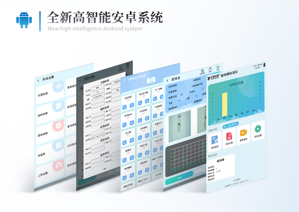 | 儀器采用10.1英寸液晶觸摸屏顯,搭配運(yùn)行安卓智能操作系統(tǒng),主控芯片采用ARM Cortex-A7,RK3288/4核處理器,主頻1.88Ghz,運(yùn)轉(zhuǎn)速度更快速,性能更強(qiáng)。 | 儀器功能包括:膠體金檢測(cè)模塊、數(shù)字化管理模塊、無(wú)線通訊模塊等,可以滿足同一軟件下實(shí)現(xiàn)所有檢測(cè)項(xiàng)目的檢測(cè),并在同一窗口展示檢測(cè)結(jié)果。 | 一體化臺(tái)式快檢設(shè)備,采用交直流兩用供電方式,可連接車載電源,配備6ah大容量充電鋰電池,可以滿足現(xiàn)場(chǎng)及流動(dòng)檢測(cè)使用的需求。儀器尺寸:43×35×20cm, 主機(jī)凈重:5.1kg | 系統(tǒng)自帶數(shù)據(jù)集成模塊,設(shè)備首頁(yè)自動(dòng)統(tǒng)計(jì)檢測(cè)數(shù)據(jù)包含:周檢測(cè)數(shù)據(jù)、月檢測(cè)數(shù)據(jù),全部檢測(cè)總數(shù)量,均包含檢測(cè)總數(shù),合格數(shù),不合格數(shù),以及相關(guān)柱形分析圖,對(duì)各項(xiàng)檢測(cè)數(shù)據(jù)清晰掌握,無(wú)需電腦查詢,更加快捷直觀。 | 儀器具有任務(wù)預(yù)設(shè)模塊,可在樣品送檢前提前預(yù)設(shè)樣品名稱、檢測(cè)指標(biāo)、送檢單位等信息,樣品送檢時(shí)一鍵調(diào)取保存信息,檢測(cè)更加方便快捷。 | 直插式自動(dòng)掃描方式,可實(shí)時(shí)顯示金標(biāo)卡實(shí)時(shí)圖像,系統(tǒng)自動(dòng)分析并呈現(xiàn)出CT曲線圖,CT線自動(dòng)識(shí)別,無(wú)需手動(dòng)調(diào)整,完成檢測(cè)后自動(dòng)退出檢測(cè)卡。 | 膠體金模塊檢測(cè)方式:軌道式自動(dòng)傳輸掃描,檢測(cè)完成后自動(dòng)退出檢測(cè)卡。 | 儀器檢測(cè)系統(tǒng)擁有龐大數(shù)據(jù)庫(kù),并且構(gòu)建了完善的檢索、修訂功能。食品庫(kù)涵蓋多種樣品名稱,可按需添加或刪除、編輯樣品名稱;產(chǎn)品數(shù)據(jù)庫(kù)以及歷史檢測(cè)記錄支持一鍵檢索功能。 | 系統(tǒng)打印自定義化,打印格式多樣化,產(chǎn)品合格證(國(guó)家標(biāo)準(zhǔn)要求),二維碼,抽樣信息、檢測(cè)信息,受檢信息、復(fù)核信息、抽樣日期、檢測(cè)日期等信息結(jié)果,可按需求自行設(shè)置打印內(nèi)容。 | A4紙版本報(bào)告打印功能(可選配):設(shè)備擁有兩種結(jié)果展示方式,可以自動(dòng)生成A4打印模板和小票打印模板兩種樣式,可通過WiFi及網(wǎng)線等方式鏈接外置打印機(jī)可進(jìn)行打印 | 儀器具有 wifi 聯(lián)網(wǎng)上傳、RJ45網(wǎng)線連接功能,可以快速上傳數(shù)據(jù)。同步對(duì)接監(jiān)管平臺(tái),數(shù)據(jù)可局域網(wǎng)和互聯(lián)網(wǎng)數(shù)據(jù)上傳,檢測(cè)結(jié)果直接傳至食品安全監(jiān)管平臺(tái)。進(jìn)行區(qū)域食品安全監(jiān)管及大數(shù)據(jù)分析處理與數(shù)據(jù)統(tǒng)計(jì),檢測(cè)區(qū)域食品安全長(zhǎng)短期動(dòng)態(tài),達(dá)到食品安全問題預(yù)估、預(yù)警。 | 設(shè)備支持U盤存儲(chǔ),標(biāo)準(zhǔn)USB接口,免驅(qū)動(dòng)安裝。檢測(cè)結(jié)果存儲(chǔ)容量20萬(wàn)條以上,可生成Excel表格,進(jìn)行一鍵拷貝,并具有登錄保護(hù)功能,可設(shè)置用戶名及密碼,規(guī)范不同人員操作權(quán)限,防止非工作人員操作,并且可以進(jìn)行重新校準(zhǔn)、鎖定、恢復(fù)出廠設(shè)置功能。儀器固件可升級(jí),后期檢測(cè)項(xiàng)目可擴(kuò)充。 | 儀器具備遠(yuǎn)程升級(jí)功能,可定向分客戶分儀器更新,開機(jī)后自動(dòng)更新,并可持續(xù)性免費(fèi)更新系統(tǒng)版本,無(wú)需像傳統(tǒng)產(chǎn)品返廠更新,節(jié)省時(shí)間及人力成本并避免了物流運(yùn)輸返廠升級(jí)導(dǎo)致設(shè)備損壞的潛在風(fēng)險(xiǎn)。 |