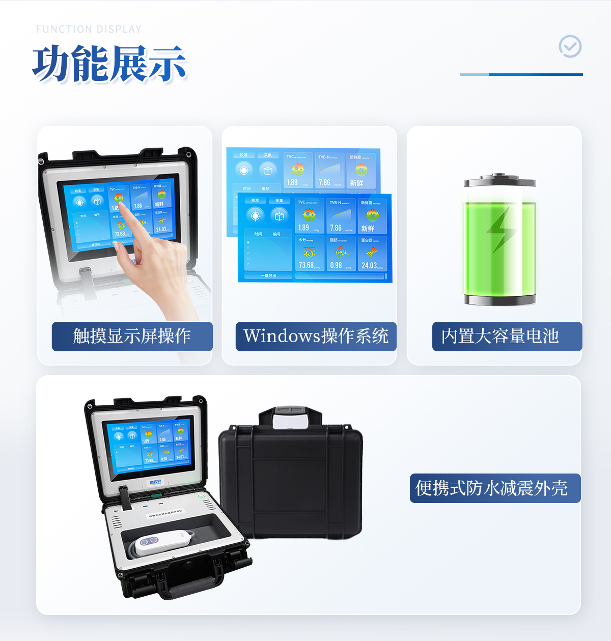 可用于檢測生鮮肉的蛋白質(zhì)、脂肪、水分、pH、TVC、TVB-N、新鮮度、L*、A*、B*等品質(zhì)參數(shù)。配備手提