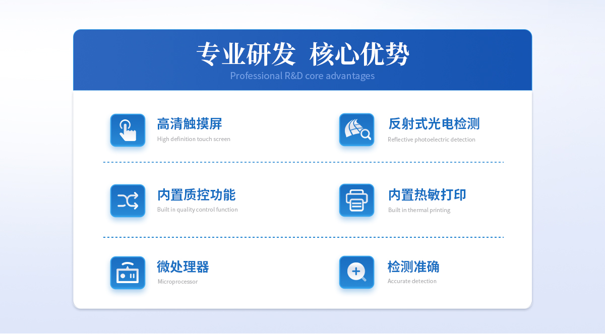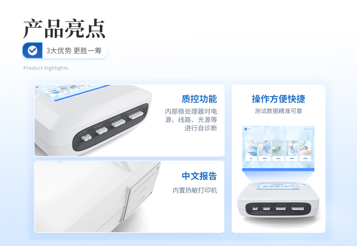 | 1、 Android觸控系統(tǒng)結(jié)合大尺寸高清屏幕,界面友好,操作簡單流暢,無需外接設(shè)備; | 2、 6通道可以同時(shí)檢測不同項(xiàng)目,顯著提升檢測效率,滿足批量樣本快速處理需求; | 3、 二維碼掃描錄入樣本信息,避免人工錯(cuò)誤 | 4、 8G超大容量內(nèi)存,支持按日期靈活查詢、預(yù)覽、刪除結(jié)果,并生成多樣化專業(yè)報(bào)告。 | 5、 內(nèi)置熱敏打印機(jī),檢測完成即可現(xiàn)場打印標(biāo)準(zhǔn)報(bào)告,提升工作效率。 | 6、 關(guān)鍵部件實(shí)時(shí)自診斷功能,保障儀器長期穩(wěn)定運(yùn)行。 | 7、 高速有線/無線網(wǎng)絡(luò)及藍(lán)牙,構(gòu)建完善的數(shù)據(jù)監(jiān)控平臺(tái),實(shí)現(xiàn)數(shù)據(jù)實(shí)時(shí)上傳、遠(yuǎn)程查詢、統(tǒng)計(jì)分析和監(jiān)管協(xié)同。 | 8、 豐富的接口設(shè)計(jì),輕松連接電腦、U盤、網(wǎng)絡(luò)及上位機(jī)系統(tǒng),支持U盤導(dǎo)出。 | 9、 孵育模塊為特定試紙條反應(yīng)提供**溫度環(huán)境。 | 10、 流線型結(jié)構(gòu),緊湊輕便,兼顧實(shí)驗(yàn)室耐用性與檢測需求。 | 11、 插卡判斷:檢測卡未插入檢測通道不能檢測 | 12、 內(nèi)置質(zhì)控功能,可設(shè)備送檢、設(shè)備自檢、試劑卡自檢 | 13、 檢測方式:孵育檢測、即時(shí)檢測(對(duì)檢測數(shù)據(jù)復(fù)檢核實(shí)) | 14、 檢測曲線:可以對(duì)試劑卡的檢測核驗(yàn),防止誤判 | 15、 檢測結(jié)果:報(bào)告出檢測項(xiàng)目、被測物質(zhì)的濃度、檢測單位、被檢查單位、檢驗(yàn)員、檢測時(shí)間、檢測限等信息可在觸摸屏上顯示,可通過儀器內(nèi)置打印機(jī)輸出 | 16、 項(xiàng)目管理:支持檢測項(xiàng)目拓展功能 | 17、 界面設(shè)置:可修改標(biāo)題和頁尾信息,靈活展示儀器信息 |