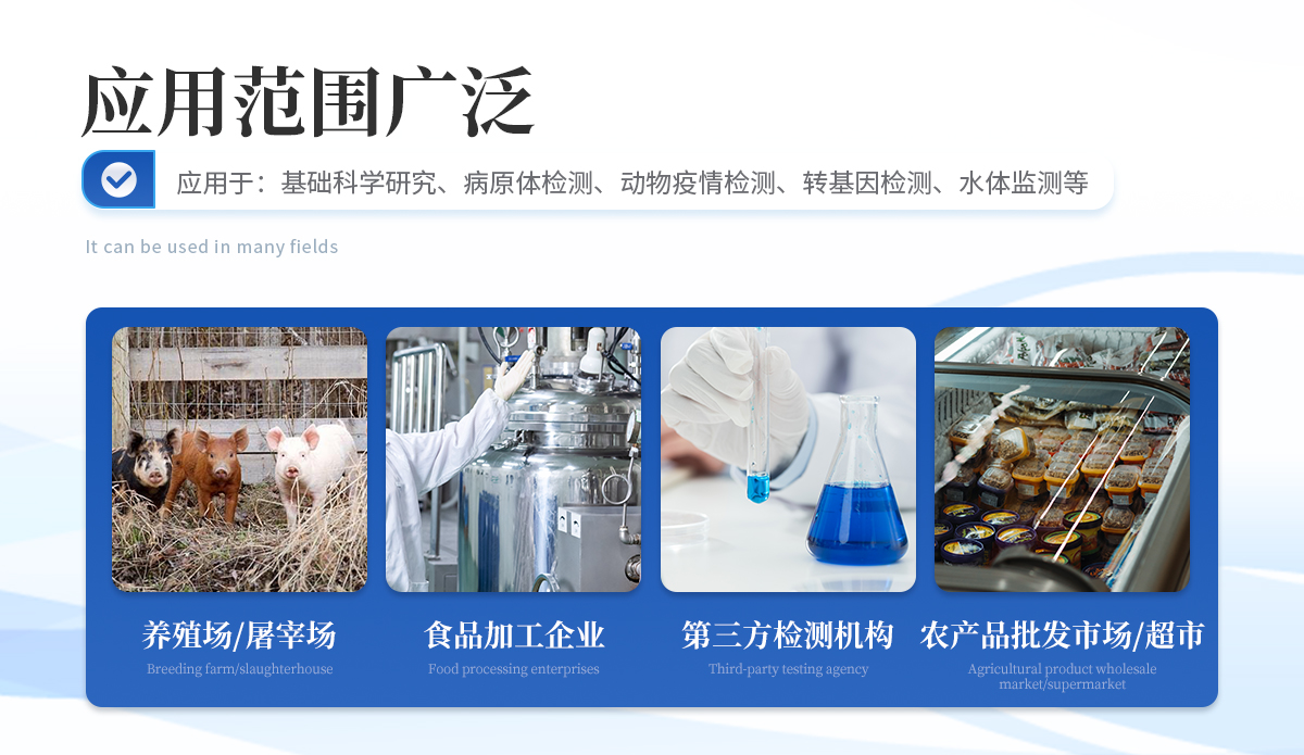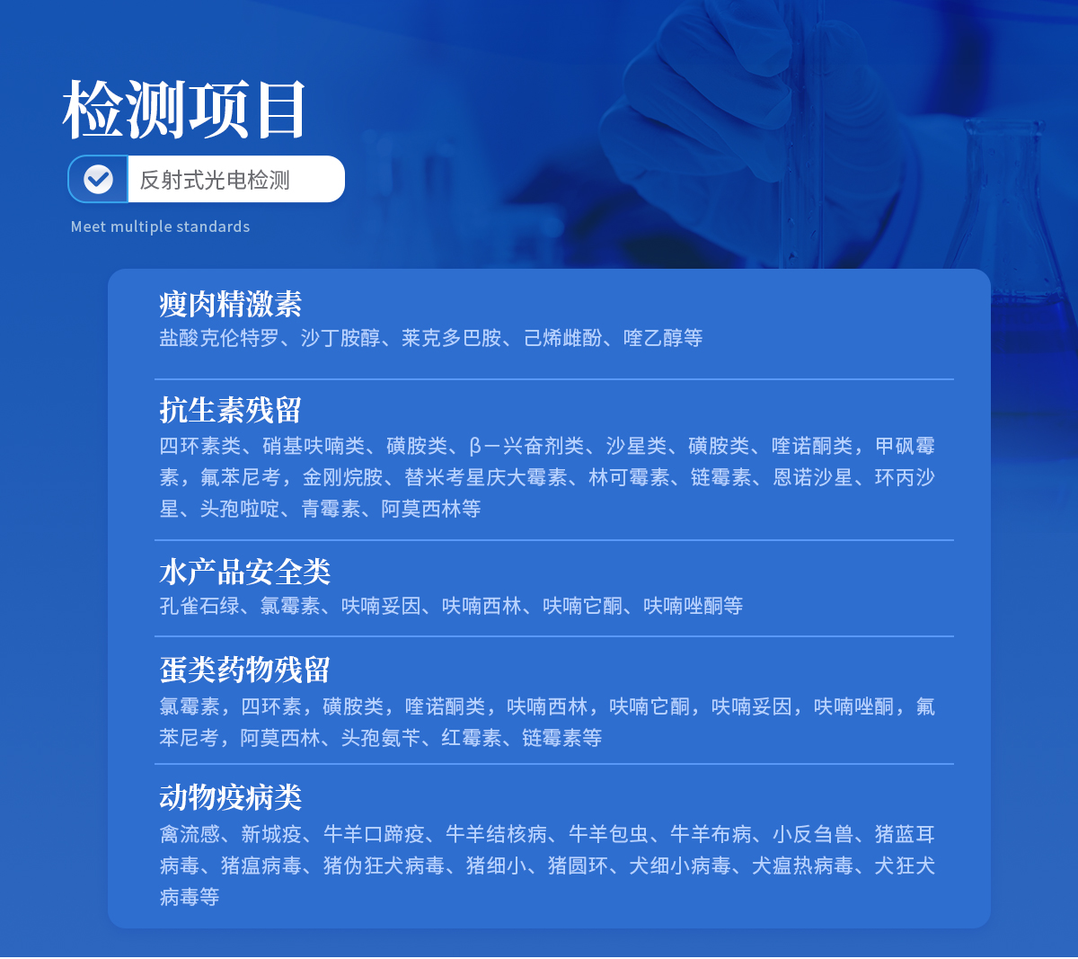 | 1、 瘦肉精激素:鹽酸克倫特羅、沙丁胺醇、萊克多巴胺、己烯雌酚、喹乙醇等 | 2、 抗生素殘留:四環(huán)素類、硝基呋喃類、磺胺類、β-興奮劑類、沙星類、磺胺類、喹諾酮類,甲砜霉素,氟苯尼考,金剛烷胺、替米考星、慶大霉素、林可霉素、鏈霉素、恩諾沙星、環(huán)丙沙星、頭孢啦啶、青霉素、阿莫西林等 | 3、 水產(chǎn)品安全類:孔雀石綠、氯霉素、呋喃妥因、呋喃西林、呋喃它酮、呋喃唑酮等 | 4、 蛋類藥物殘留 氯霉素,四環(huán)素,磺胺類,喹諾酮類,呋喃西林,呋喃它酮,呋喃妥因,呋喃唑酮,氟苯尼考,阿莫西林、頭孢氨芐、紅霉素、鏈霉素等 | 5、 動(dòng)物疫病類:禽流感、新城疫、牛羊口蹄疫、牛羊結(jié)核病、牛羊包蟲、牛羊布病、小反芻獸、豬藍(lán)耳病毒、豬瘟病毒、豬偽狂犬病毒、豬細(xì)小、豬圓環(huán)、犬細(xì)小病毒、犬瘟熱病毒、犬狂犬病毒等 |