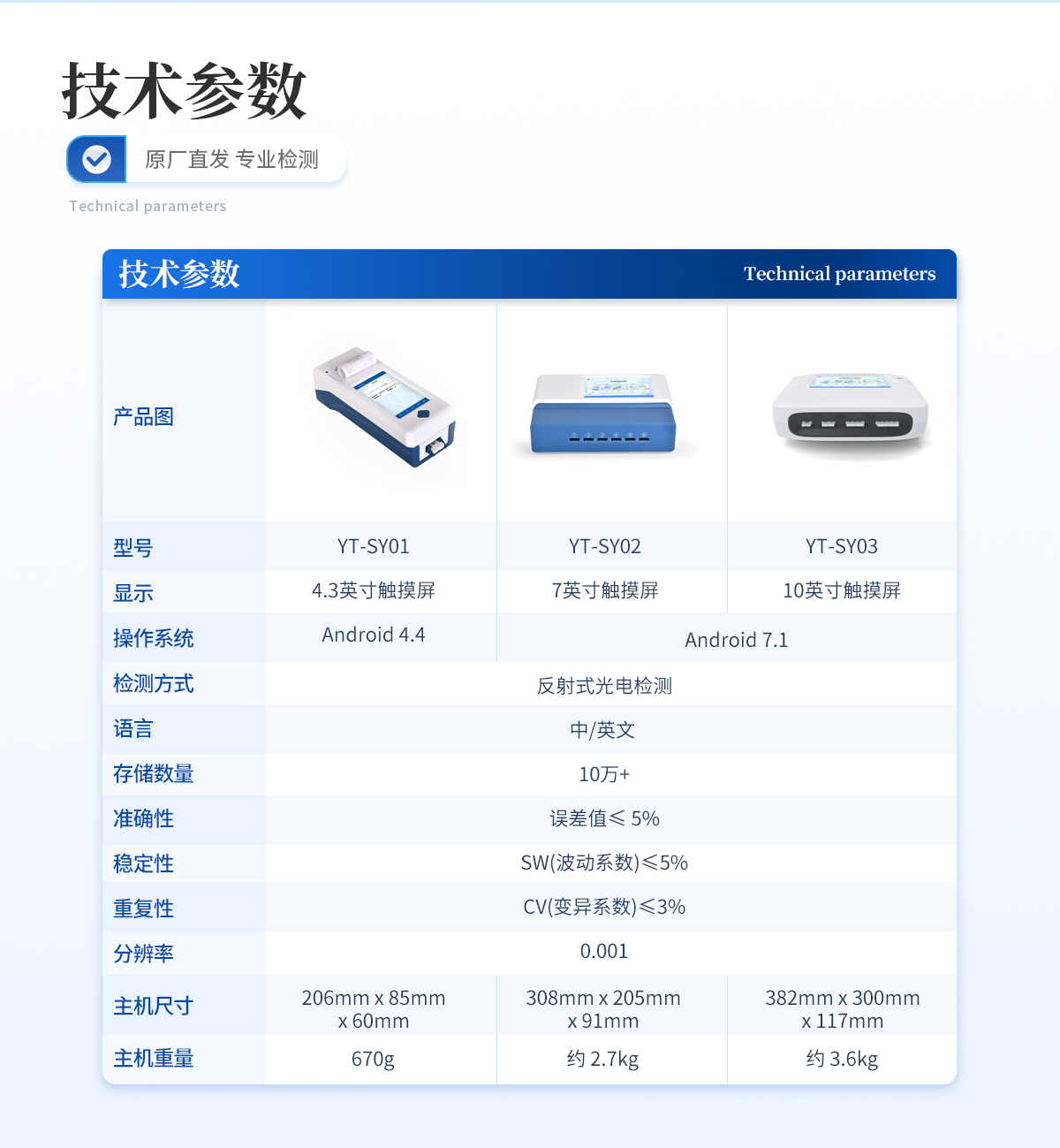 | 1、 7英寸電容式觸摸屏,分辨率:1920:x:1200,內(nèi)部存儲(chǔ):1+8GB | 2、 操作系統(tǒng):Android:7.1 | 3、 檢測方式:反射式光電檢測 | 4、 適配卡殼:70mm*20mm | 5、 語言:中/英文: | 6、 存儲(chǔ)數(shù)量:10萬+ | 7、 準(zhǔn)確性:誤差值≤:5% | 8、 穩(wěn)定性:SW(波動(dòng)系數(shù))≤5% | 9、 重復(fù)性:CV(變異系數(shù))≤3% | 10、分辨率:0.001 | 11、檢測通道:6通道檢測 | 12、檢測時(shí)間:<5秒(單卡及多聯(lián)卡);可對(duì)樣本進(jìn)行膠體金定性/半定量檢測。 | 13、數(shù)據(jù)傳輸:WiFi、藍(lán)牙、USB、射頻讀卡、外置掃碼模塊(選配) | 14、數(shù)據(jù)處理:可通過通訊端口進(jìn)行數(shù)據(jù)匯總、上傳監(jiān)管平臺(tái)等 | 15、檢測通道孵育檢測一體,溫度范圍::室溫:+5℃:~:60℃ | 16、打印機(jī):熱敏打印機(jī)(熱敏打印紙:57*20mm) | 17、接口:USB接口:2個(gè);USB-B接口:1個(gè);LAN接口:1個(gè):;DC電源接口:5.5/2.1mm | 18、電源:輸入:AC100V-240V/1.3A 50Hz;輸出:DC12V/5A | 19、使用環(huán)境:溫度:0~50℃;濕度:0~90%: | 20、主機(jī)尺寸::308mm*205mm*91mm | 21、主機(jī)重量:約:2.7kg |