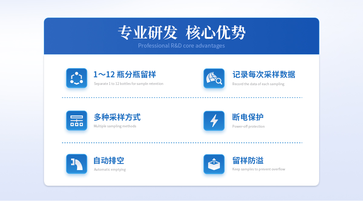 | 1.定時(shí)采樣:按照采樣定時(shí)表設(shè)定,水質(zhì)自動(dòng)采樣器將定量水樣從采樣點(diǎn)采 集到留樣瓶中。 | 2.時(shí)間等比例采樣:按照設(shè)定采樣時(shí)間間隔,水質(zhì)自動(dòng)采樣器將定量水樣從 采樣點(diǎn)采集到到留樣瓶中。 | 3.流量等比例采樣:每流過一定體積的水體,水質(zhì)自動(dòng)采樣器自動(dòng)將定量水樣從采樣點(diǎn)采集到留樣瓶中。 | 4.超標(biāo)留樣(外控采樣):當(dāng)接收到外部觸發(fā)信號(hào)一開關(guān)量信號(hào)時(shí)或模擬量信號(hào),水質(zhì)自動(dòng)采樣器將定量水樣從采樣點(diǎn)采集到留樣瓶中。 | 5.串口控制:當(dāng)接收到串口命令時(shí),按命令要求進(jìn)行采樣。 |