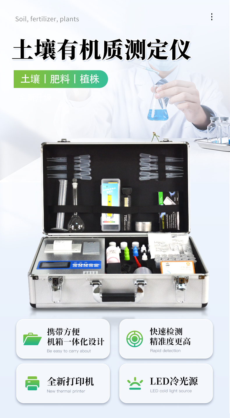 配套齊全:土壤有機質速測儀該儀器集藥、器、儀為一體,攜帶方便,相當于一個小型實驗室。適于農業(yè)服務部門或農資經(jīng)銷商、肥料廠商測土施肥和鑒別肥料真假。