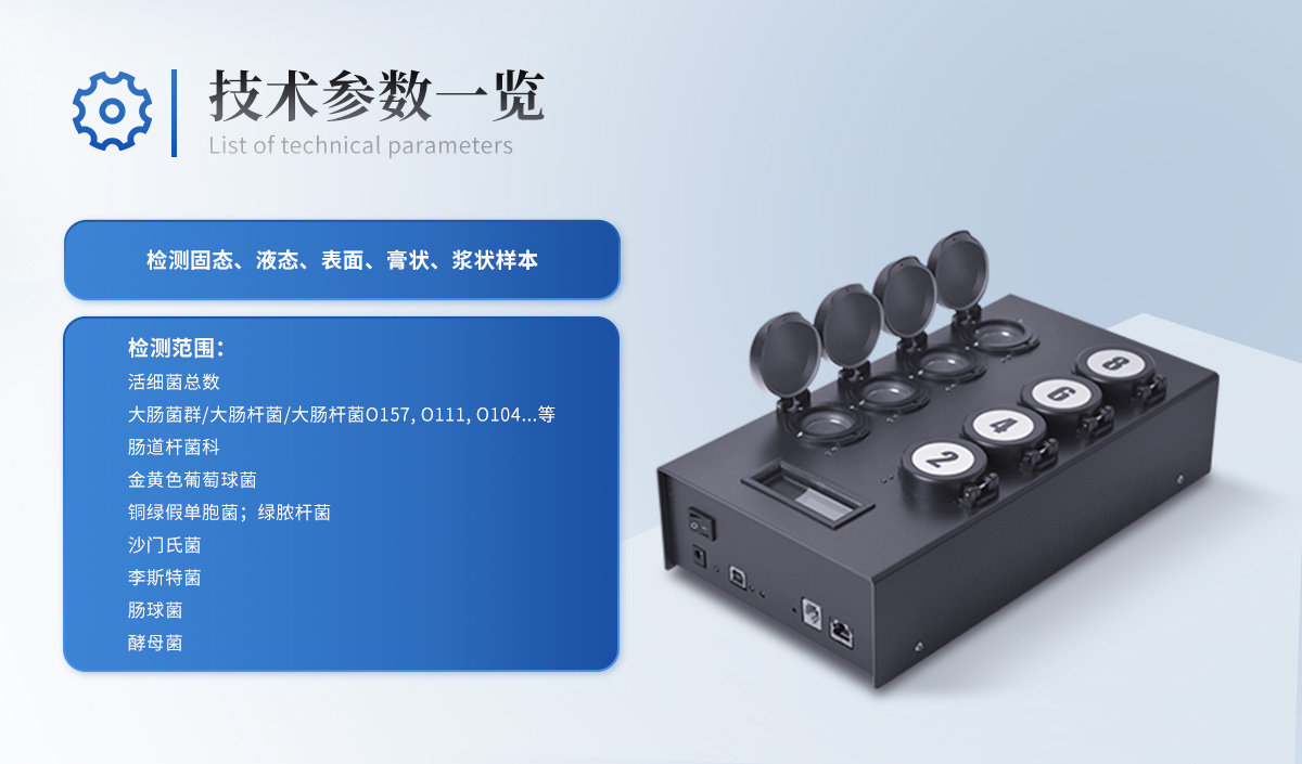 | 1. 靈敏度:1CFU/mL(g) | 2. 量程:1~9 × 109CFU/mL 或CFU/g | 3. 特異性:99.999% | 4. 波長范圍:400~680nm | 5. 軟件兼容操作系統(tǒng):Windows XP、Vista、7/8/10 | 6. 尺寸:≤ 31x17,5x8 cm (W x L x H) + 適配器 | 7. 重量:≤ 1.28kg+ 適配器 |