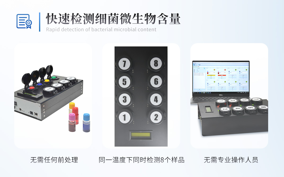 | 1.每種微生物快速檢測試劑瓶檢測不同微生物,試劑瓶內(nèi)含有針對特定微生物類的氧化還原酶。當被微生物污染的樣品插入試劑瓶后,氧化還原酶會發(fā)生化學反應(yīng),導致瓶中液體的顏色發(fā)生變化,液體顏色會根據(jù)瓶中微生物的數(shù)量發(fā)生變化。 | 2.含樣品的試劑瓶可放置在30oC,37oC或44oC的小型細菌培養(yǎng)箱中,或放置在MBS微生物快速檢測儀中進行 | 3. MBS微生物快速檢測儀,可同時對8個試劑瓶(八份不同菌種樣品)獨立地檢測,分別控制溫度,并分別給出定量分析報告。分析報告通過單獨安裝的軟件進行讀取,軟件適合系統(tǒng)包括:Windows XP、Vista | 4.使用后,按壓容器口將氯基溶液添加到容器內(nèi)以此殺菌,容器內(nèi)微物幾分鐘可殺死達到消毒目的。 |