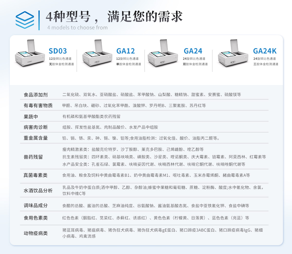 | 食品添加劑:二氧化硫、雙氧水、亞硝酸鹽、硝酸鹽、苯甲酸鈉、山梨酸鉀、糖精鈉、甜蜜素、木耳硫酸鎂等 | 有毒有害物質(zhì):甲醛、吊白塊、硼砂、過(guò)氧化苯甲酰、溴酸鉀、羅丹明B、三聚氰胺、蘇丹紅、工業(yè)堿、尿素、明礬等 | 果蔬:農(nóng)藥殘留(酶抑制率法) | 病害肉:組胺、揮發(fā)性鹽基氮 | 重金屬含量:鉛、鎘、鉻、汞、砷、錫、鎳、鋁等 | 水產(chǎn)品安全類(lèi):孔雀石綠、氯霉素、呋喃妥因、呋喃西林、呋喃它酮、呋喃唑酮等 | 瘦肉精激素類(lèi)(獸藥):鹽酸克倫特羅、沙丁胺醇、萊克多巴胺、己烯雌酚等 | 抗生素殘留:四環(huán)素類(lèi)、硝基呋喃類(lèi)、磺胺類(lèi)、β-興奮劑類(lèi)、沙星類(lèi)、磺胺類(lèi)、喹諾酮類(lèi),甲砜霉素,氟苯尼考,金剛烷胺、替米考星、慶大霉素、林可霉素、鏈霉素、恩諾沙星、環(huán)丙沙星、頭孢啦啶、青霉素、阿莫西林等 | 真菌毒素類(lèi):食用油、糧食及飼料中黃曲霉毒素B1、黃曲霉毒素總量,奶中黃曲霉毒素M1、嘔吐毒素、玉米赤霉烯酮、赭曲霉毒素A、T2毒素、伏馬毒素等 | 調(diào)味品成分: 食醋的總酸、醬油的總酸、芝麻油純度、谷氨酸鈉、醬油氨基酸態(tài)氮、食鹽中亞鐵氰化鉀、食鹽中碘等 | 食用色素類(lèi):紅色色素(胭脂紅、莧菜紅、莧菜紅)、黃色色素(檸檬黃、日落黃)、藍(lán)色色素(亮藍(lán))等 | 動(dòng)物疫病類(lèi):禽流感、新城疫、牛羊口蹄疫、牛羊結(jié)核病、牛羊包蟲(chóng)、牛羊布病、小反芻獸、豬藍(lán)耳病毒、豬瘟病毒、豬偽狂犬病毒、豬細(xì)小、豬圓環(huán)、犬細(xì)小病毒、犬瘟熱病毒、犬狂犬病毒等 | 蜂蜜成分:果糖和葡萄糖、蔗糖、淀粉酶、酸度等 | 食用油檢測(cè):過(guò)氧化值、酸價(jià)等 | 蛋類(lèi)藥物殘留:氯霉素,四環(huán)素,磺胺類(lèi),喹諾酮類(lèi),呋喃西林,呋喃它酮,呋喃妥因,呋喃唑酮,氟苯尼考,阿莫西林、頭孢氨芐、紅霉素、鏈霉素等 | 酒類(lèi)及乳品牛奶中蛋白質(zhì):酒中甲醇、乙醇、乳品及牛奶中蛋白質(zhì)、乳品硫氰酸鈉、三聚氰胺, |