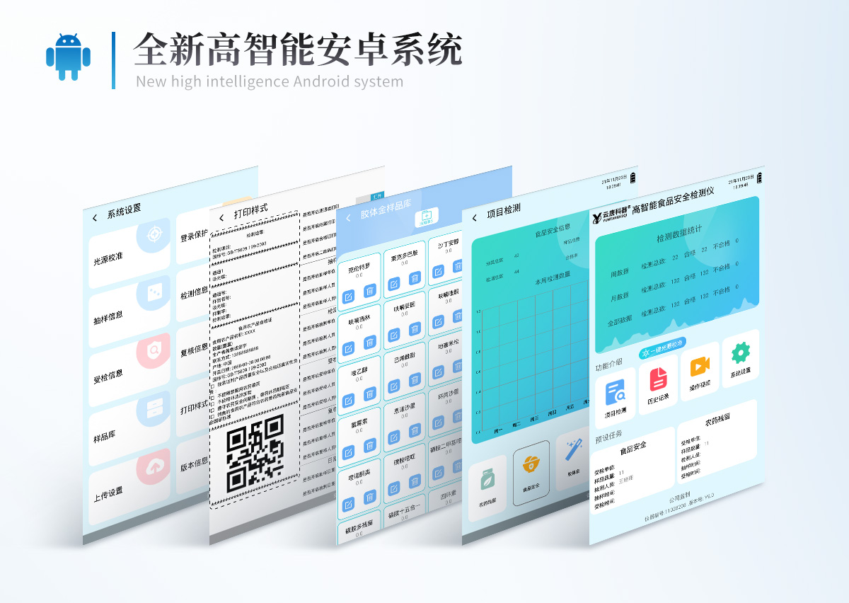 | 儀器采用臺(tái)式一體化系統(tǒng)檢測(cè)技術(shù),將分光光度模塊、膠體金檢測(cè)模塊、新型農(nóng)殘檢測(cè)模塊、數(shù)字化管理模塊、無(wú)線(xiàn)通訊模塊高度集成于一體,支持檢測(cè)200種食品安全檢測(cè)項(xiàng)目,同時(shí)預(yù)留升級(jí)檢測(cè)方法。 | 儀器檢測(cè)模塊標(biāo)準(zhǔn)化、智能化,可隨意自由組合。檢測(cè)箱體內(nèi)置多個(gè)標(biāo)準(zhǔn)檢測(cè)單元,檢測(cè)模塊可以調(diào)整配置。 | 顯示屏幕:儀器采用10.1英寸豎向液晶觸摸屏顯,搭配運(yùn)行安卓智能操作系統(tǒng),主控芯片采用ARM Cortex-A7,RK3288/4核處理器,主頻1.88Ghz,操作方便,性能更強(qiáng)。 | 檢測(cè)通道:≥12通道;采用精密旋轉(zhuǎn)比色池設(shè)計(jì),使用同芯片同光源校準(zhǔn)精度,解決不同光源之間的誤差值。1-12通道間誤差0.1%。(***:**202022821055.2) | 儀器光源:高精度進(jìn)口四波長(zhǎng)冷光源,每個(gè)通道均配置 410、520、590、630nm 波長(zhǎng)光源,標(biāo)配**的光路切換裝置,專(zhuān)利光路切換功能可實(shí)現(xiàn)64波長(zhǎng),并且所有檢測(cè)項(xiàng)目可實(shí)現(xiàn)所有通道同時(shí)檢測(cè)。 | 設(shè)備可一鍵校準(zhǔn),自動(dòng)保存校準(zhǔn)數(shù)據(jù),自動(dòng)對(duì)比校驗(yàn),得到精準(zhǔn)光源,采用Android SP存儲(chǔ)數(shù)據(jù),光源數(shù)據(jù)永不丟失,方便每一次使用。 | 通訊接口: 配備無(wú)線(xiàn)通信模塊、可選配4G(APN)通訊模塊和藍(lán)牙傳輸,同時(shí)具有雙USB接口以及RJ45網(wǎng)線(xiàn)接口,可以多方式實(shí)現(xiàn)數(shù)據(jù)保存及數(shù)據(jù)傳輸。 | 存儲(chǔ)方式: 支持U盤(pán)存儲(chǔ),標(biāo)準(zhǔn)USB接口,免驅(qū)動(dòng)安裝。檢測(cè)結(jié)果存儲(chǔ)容量20萬(wàn)條以上,可生成Excel表格進(jìn)行拷貝,并具有登錄保護(hù)功能。 | 智能化操作系統(tǒng): | 操作系統(tǒng):儀器可在同一檢測(cè)界面自動(dòng)對(duì)應(yīng)相關(guān)檢測(cè)通道,一次性選擇1-12個(gè)樣品名稱(chēng),無(wú)需退出界面,節(jié)省操作時(shí)間。并可以對(duì)每個(gè)通道屬性和樣品信息單獨(dú)進(jìn)行編輯,例如送檢單位、人員,檢測(cè)人員等,打印時(shí)勾選打印顯示。 | 數(shù)據(jù)集成系統(tǒng):設(shè)備首頁(yè)自動(dòng)匯總分析檢測(cè)數(shù)據(jù),包含:周檢測(cè)數(shù)據(jù)、月檢測(cè)數(shù)據(jù),全部檢測(cè)總數(shù)量,均包含檢測(cè)總數(shù),合格數(shù),不合格數(shù),以及相關(guān)柱形分析圖,各項(xiàng)檢測(cè)數(shù)據(jù)一目了然,無(wú)需電腦查詢(xún),更加快捷直觀。 | 數(shù)據(jù)庫(kù)系統(tǒng):十幾項(xiàng)數(shù)據(jù)庫(kù)分類(lèi)管理儀器:包含項(xiàng)目類(lèi)型、項(xiàng)目數(shù)據(jù)、檢測(cè)數(shù)據(jù)、歷史記錄、國(guó)標(biāo)信息、曲線(xiàn)信息、采樣信息、檢測(cè)信息、受檢信息、復(fù)核信息、圖表信息、光源校準(zhǔn)信息、打印樣式信息、樣品庫(kù)信息等等,數(shù)據(jù)庫(kù)之間互相協(xié)調(diào)聯(lián)動(dòng)保證數(shù)據(jù)的真實(shí)完整性。同時(shí)產(chǎn)品數(shù)據(jù)庫(kù)以及歷史檢測(cè)記錄支持一鍵檢索功能。 | 限量規(guī)判系統(tǒng):具有限量查詢(xún)、添加物質(zhì)合規(guī)判定系統(tǒng)。檢測(cè)出結(jié)果后,系統(tǒng)自動(dòng)調(diào)用系統(tǒng)數(shù)據(jù)庫(kù)中相關(guān)國(guó)標(biāo)進(jìn)行比對(duì)判定,客觀顯示判定結(jié)果是否合格。 | 項(xiàng)目預(yù)設(shè)系統(tǒng):儀器具有任務(wù)預(yù)設(shè)模塊,一鍵提前預(yù)設(shè),給出方便快捷的新檢測(cè)方案,每一個(gè)任務(wù)分別可以設(shè)置不同的樣品、批次、編號(hào)、來(lái)源、備注、抽樣信息、檢測(cè)信息、受檢信息、復(fù)核信息等更多信息。樣品送檢時(shí)一鍵調(diào)取保存信息,并可多次調(diào)取,大大提高檢測(cè)效率。 | 數(shù)據(jù)監(jiān)管系統(tǒng):同步對(duì)接監(jiān)管平臺(tái),數(shù)據(jù)可局域網(wǎng)和互聯(lián)網(wǎng)數(shù)據(jù)上傳,檢測(cè)結(jié)果可選擇直接傳至食品安全監(jiān)管平臺(tái)。進(jìn)行區(qū)域食品安全監(jiān)管及大數(shù)據(jù)分析處理與數(shù)據(jù)統(tǒng)計(jì),檢測(cè)區(qū)域食品安全長(zhǎng)短期動(dòng)態(tài),達(dá)到食品安全問(wèn)題預(yù)估、預(yù)警。 | 打印系統(tǒng):內(nèi)置全新打印機(jī),新創(chuàng)自定義打印方式,可按需靈活勾選控制:產(chǎn)品合格證(國(guó)家農(nóng)業(yè)部標(biāo)準(zhǔn)要求),二維碼,抽樣信息、檢測(cè)信息,受檢信息、復(fù)核信息、抽樣日期、檢測(cè)日期等信息的打印。 | 供電模式:儀器交直流兩用,直流12V供電,可連接車(chē)載電源,可配6ah大容量充電鋰電池,電量可實(shí)時(shí)顯示,方便戶(hù)外流動(dòng)測(cè)試。 | 膠體金檢測(cè)模塊:采用單通道CMOS成像處理技術(shù)及膠體金免疫層析技術(shù),可讀取膠體金卡數(shù)據(jù),自動(dòng)采集、處理分析,將檢測(cè)結(jié)果顯示,并可根據(jù)參考限值自動(dòng)判斷檢測(cè)結(jié)果,可檢測(cè)常見(jiàn)的獸藥殘留、生物毒素、抗生素、違禁添加物等。 | 探測(cè)技術(shù):CMOS成像探測(cè); | 檢測(cè)通道:1個(gè)通道; | 檢測(cè)方式:消線(xiàn)法
