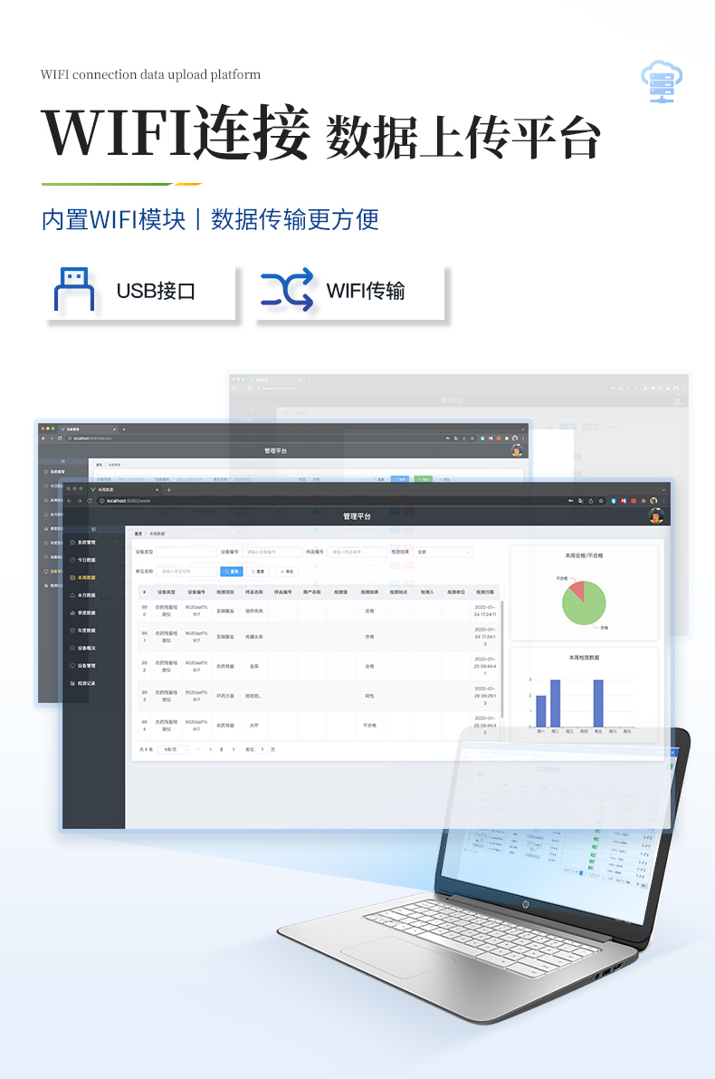 8.3、數(shù)據(jù)監(jiān)管系統(tǒng):同步對接監(jiān)管平臺,數(shù)據(jù)可局域網(wǎng)和互聯(lián)網(wǎng)數(shù)據(jù)上傳,檢測結(jié)果可選擇直接傳至食品安全監(jiān)管平臺。進行區(qū)域食品安全監(jiān)管及大數(shù)據(jù)分析處理與數(shù)據(jù)統(tǒng)計,檢測區(qū)域食品安全長短期動態(tài),達到食品安全問題預(yù)估、預(yù)警。