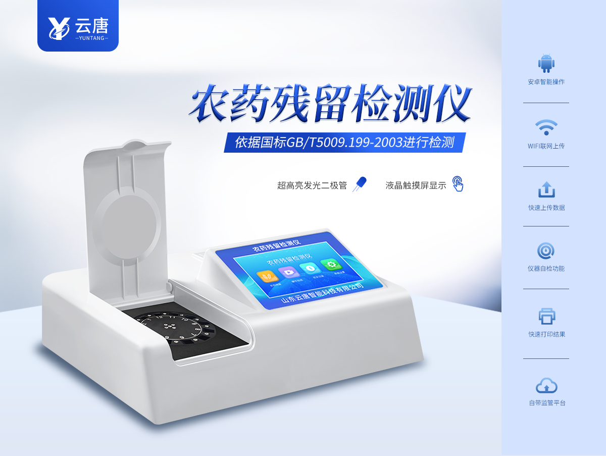 山東云唐智能科技有限公司生產(chǎn)的農藥殘留檢測儀廣泛應用于主要用于蔬菜、水果、茶葉、糧食、農副產(chǎn)品等食品中農藥殘留的快速檢測,依據(jù)國標GB/T5009.199-2003進行檢測,適用于果蔬茶生產(chǎn)基地以及農貿批發(fā)銷售市場現(xiàn)場檢測,餐館、學校、食堂、家庭果蔬加工前的安全速測等。