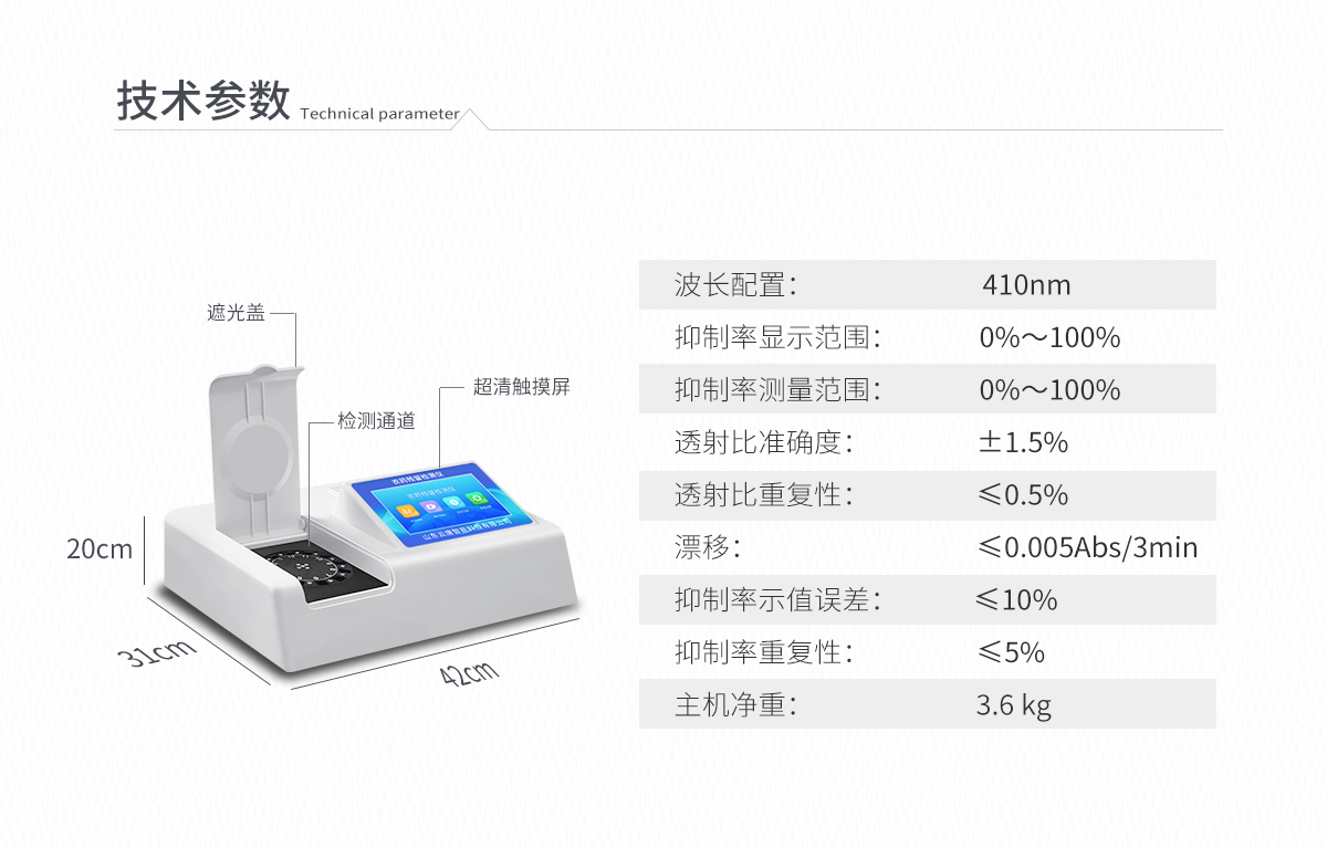 | 410nm | 0%~100% | 0%~100% | ±1.5% | ≤0.5% | ≤0.005Abs/3min | ≤10% | ≤5% | 42×31×14cm | 3.6 kg |