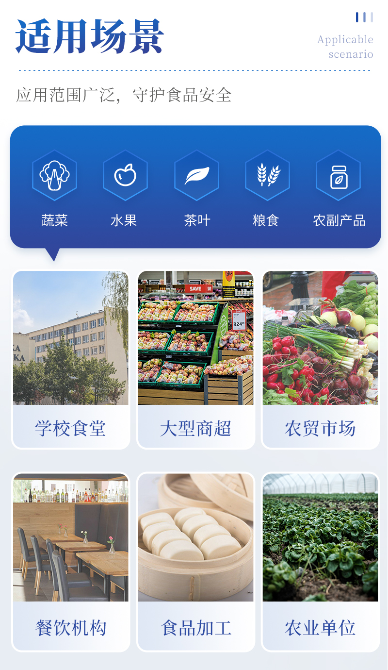 廣泛應(yīng)用于主要用于蔬菜、水果、茶葉、糧食、農(nóng)副產(chǎn)品等食品中有機(jī)磷和氨基甲酸酯類農(nóng)藥殘留的快速檢測(cè);此外還可用于果蔬茶生產(chǎn)基地和農(nóng)貿(mào)批發(fā)銷售市場(chǎng)現(xiàn)場(chǎng)檢測(cè),餐館、學(xué)校、食堂、家庭果蔬加工前的安全速測(cè)等。