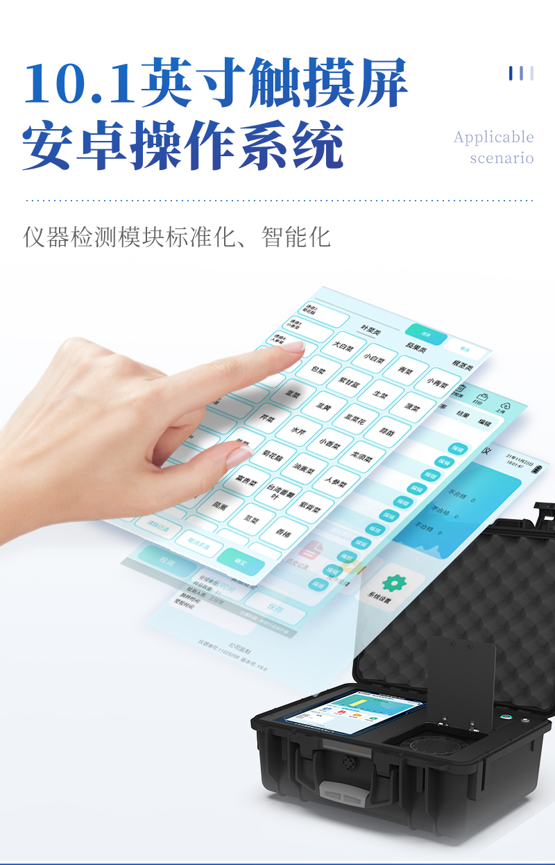 3、顯示屏幕:儀器采用10.1英寸豎向液晶觸摸屏顯,搭配運(yùn)行安卓智能操作系統(tǒng),主控芯片采用ARM Cortex-A7,RK3288/4核處理器,主頻1.88Ghz,操作方便,性能更強(qiáng)。