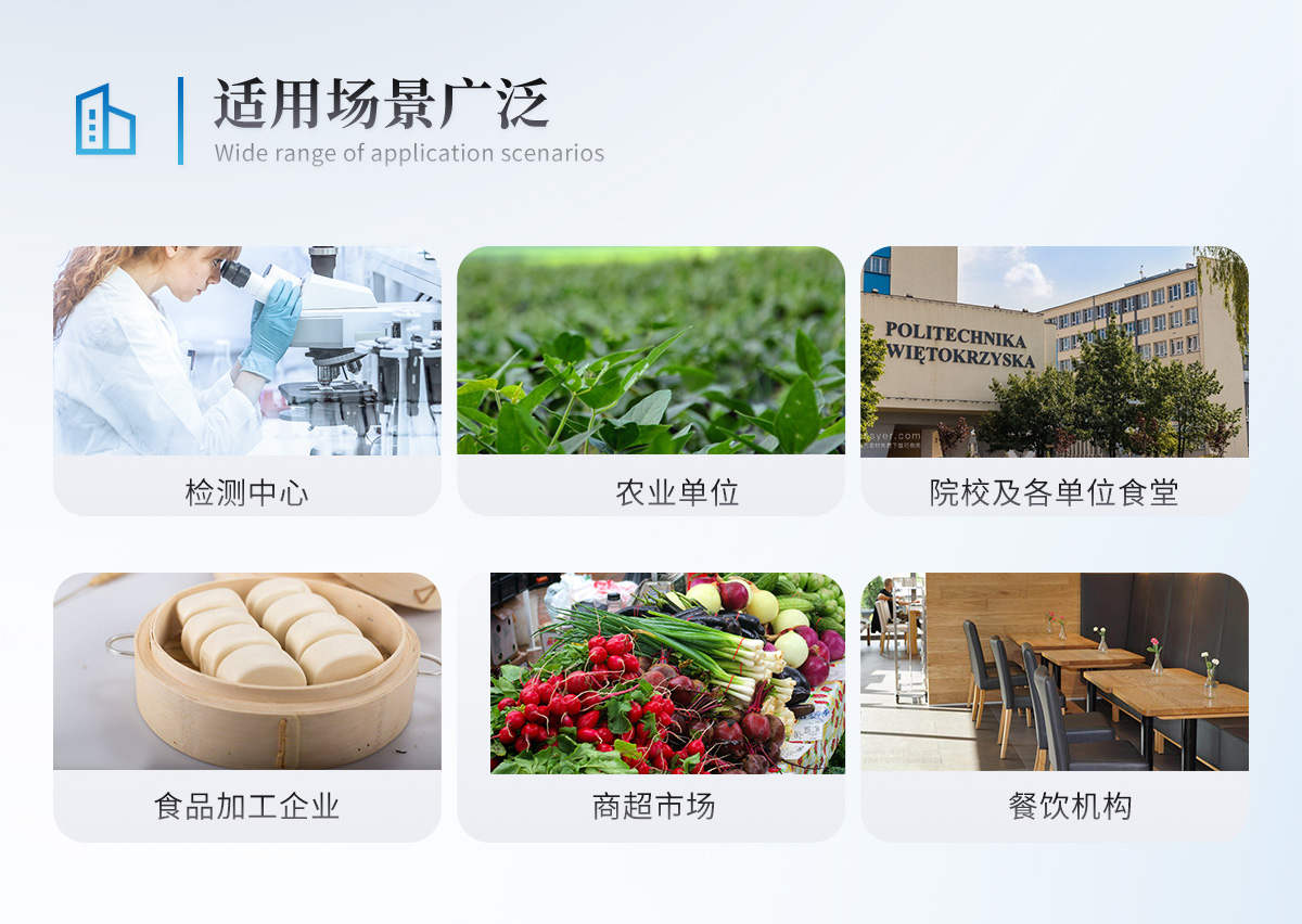 該高智能食品安全檢測儀為集成化食品安全快速檢測分析設(shè)備,目前已于食藥監(jiān)局、衛(wèi)生部門、高教院校、科研院所、農(nóng)業(yè)部門、養(yǎng)殖場、屠宰場、食品肉產(chǎn)品深加工企業(yè)及檢驗檢疫部門等單位廣泛使用。