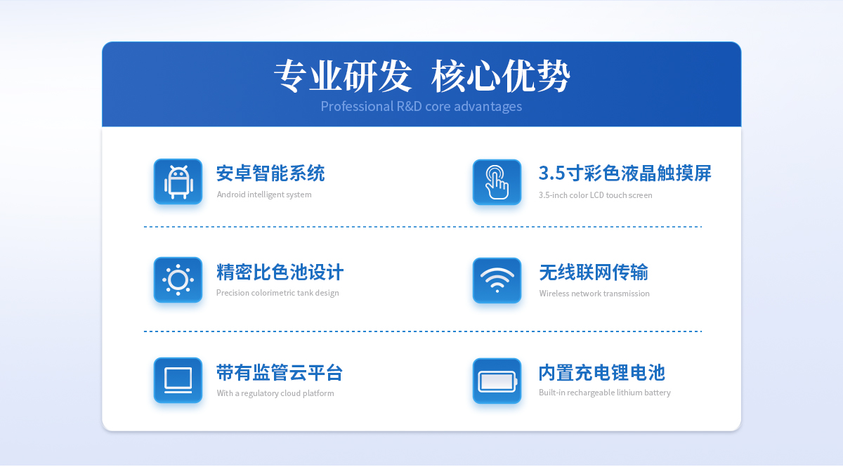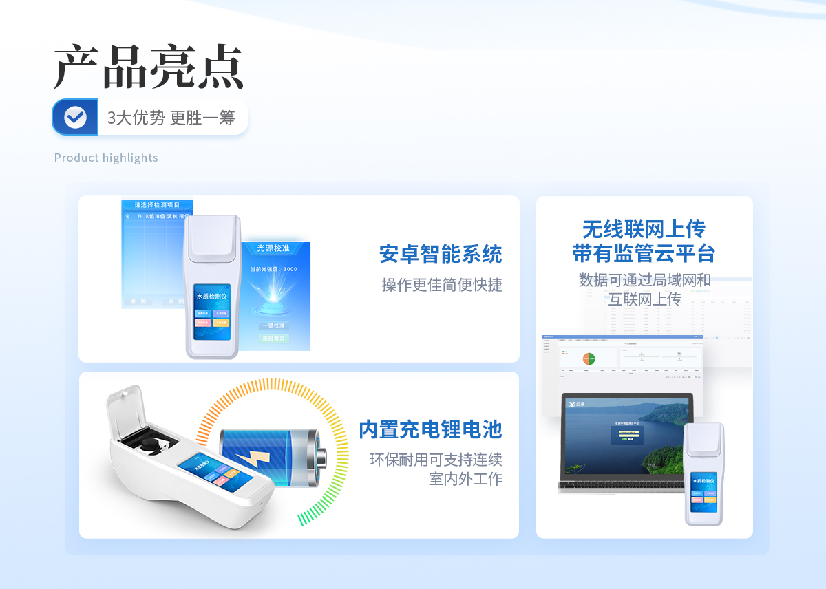 | ①安卓智能系統(tǒng),操作更佳簡便快捷; | ②配置云監(jiān)控平臺,檢測結(jié)果可直接無線傳至平臺,進(jìn)行水質(zhì)長短期分析,輔助管理。 | ③內(nèi)置操作流程、操作簡單、無需培訓(xùn)、直接上手; | ④檢測速度更快,現(xiàn)場讀取數(shù)據(jù); | ⑥便攜式體積小,重量輕,方便戶外檢測; | ⑦外形小巧美觀,工作穩(wěn)定免維護(hù),具有較好的性價比; | ⑧采用進(jìn)口冷光源,光學(xué)性能穩(wěn)定,壽命長達(dá)10萬小時; | ⑨交直流兩用,內(nèi)置充電鋰電池,環(huán)保耐用可支持連續(xù)室內(nèi)外工作。 |
