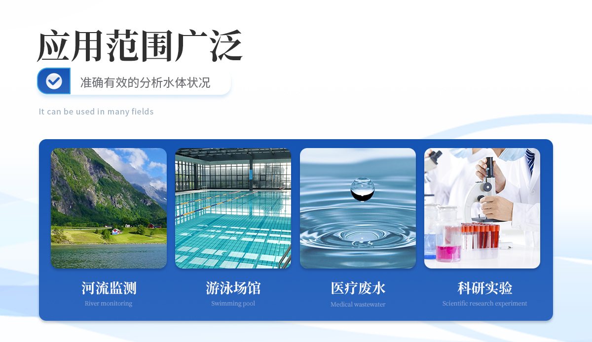 | 適用于飲用水、自來水、醫(yī)療廢水、工業(yè)污水、河流監(jiān)測、游泳場館、水源保護(hù)、科研實驗等。 |